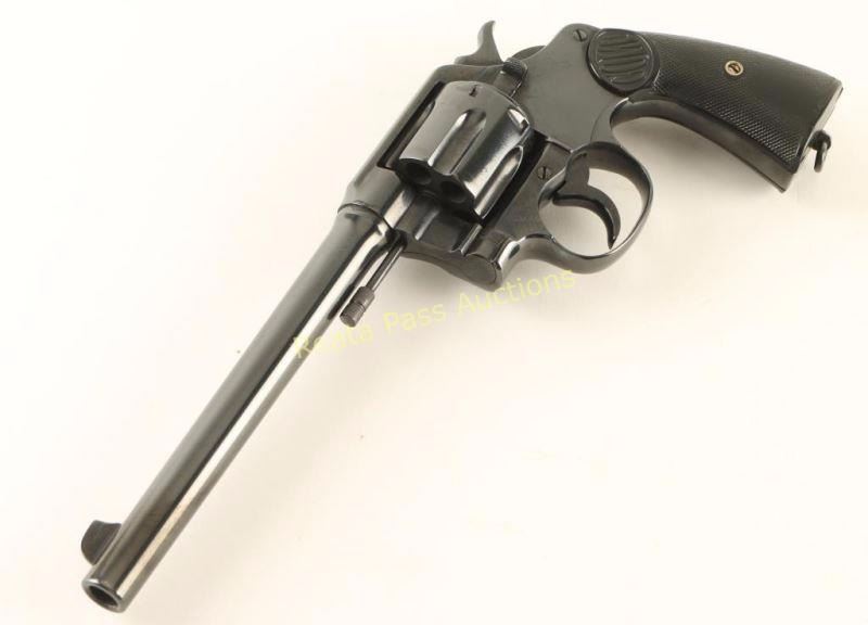 Refinished large frame double action revolver chambered in .38-40 Winchester, circa 1923. Features a fully blued refinished, 7.5" barrel with two line address, blade front sight, notched rear sight, fluted six shot cylinder, smooth trigger, checkered hammer spur, lanyard ring and two piece checkered hard rubber grips. Revolver exhibits approximately 96% of it's blued refinish with wear behind the cylinder latch, light muzzle wear, and some visible pitting under the finish. Action is smooth with a little play in the lock-up, bore is good, markings are faint but legible and grips are fair to good with a few small losses in both panels. Condition is good as refinished. ***C&R Firearm*** ***Modern Firearm***