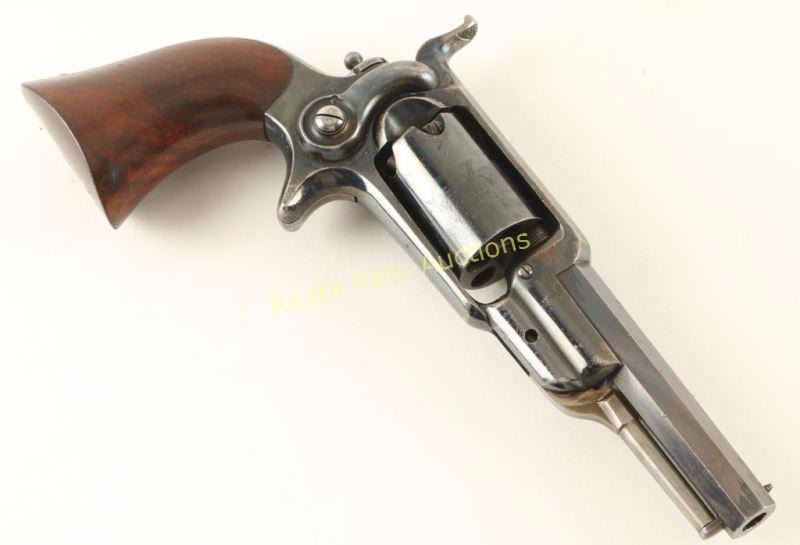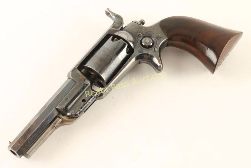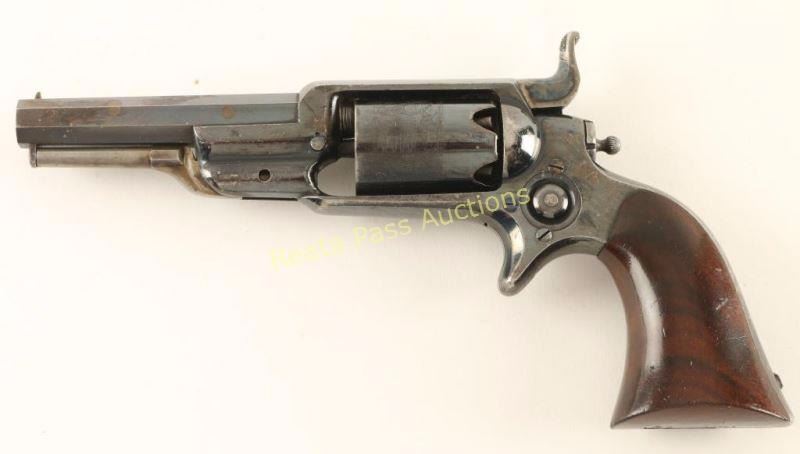 '2nd Model Root' Early single action percussion revolver chambered in .28 caliber, circa 1856. Features a high polish blued finish, 3.5" octagonal barrel with pointing hand two line address, loading lever, brass cone front sight, 'v' notched rear sight, five-shot roll stamped cylinder with 'Cabin & Indian' scene, smooth spur trigger, case hardened hammer with checkered spur, and one piece figured walnut grips. Revolver appears to be all original with matching serial numbers on butt, cylinder and barrel. Overall approximately 75% of the bright blued finish is retained with scattered losses & wear with the remained turned to a brown patina. Case colors are vivid on the hammer and visible in trace amounts on the loading lever. The brass cone front sight is slightly flattened on it's northeast face. Markings are crisp with a 90% visible cylinder scene. Action performs well, bore is excellent and wood grips are fine. Condition is excellent. ***Antique Firearm***