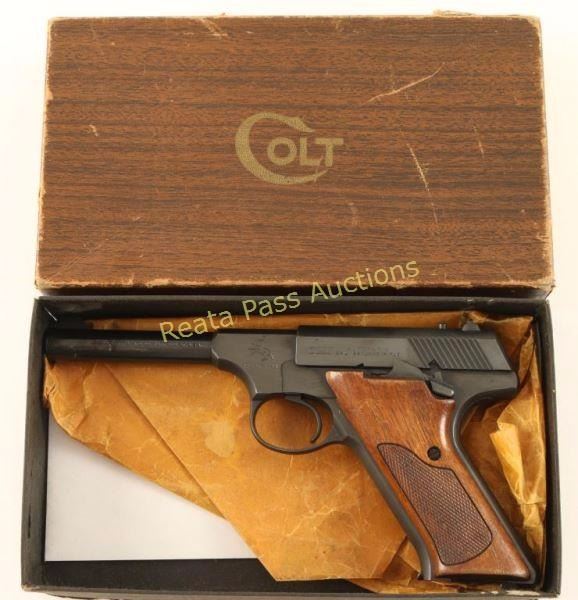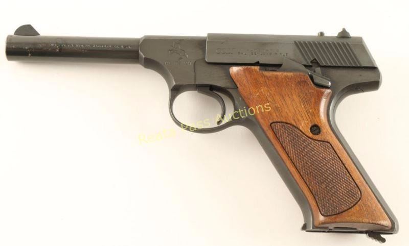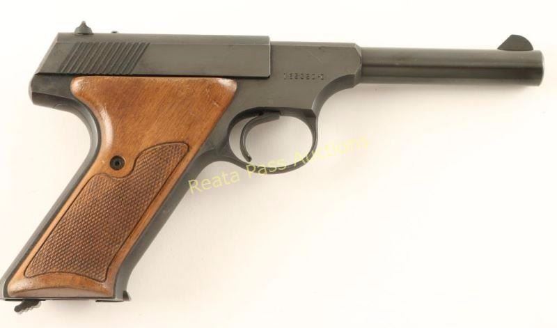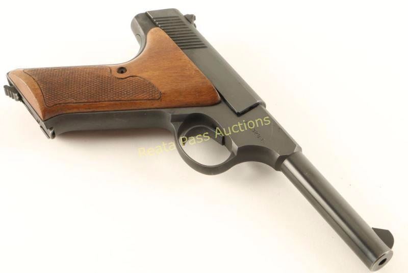 Single action semi automatic target pistol chambered in .22 Long Rifle, circa 1968. Features a blued finish, 4 1/2" barrel, blade front sight, windage adjustable rear sight, serrated slide, smooth wide trigger, thumb safety switch, 10 round factory magazine, and two piece checkered walnut grips. Includes a factory wood grain cardboard box with documents and paper. The pistol exhibits approximately 90% of it's original blued finish showing minor scratches, a few small losses and scattered light surface rust on the barrel & frame. Action is smooth, bore is excellent, and wood grips are very good. Condition is very good+. ***Modern Firearm***
