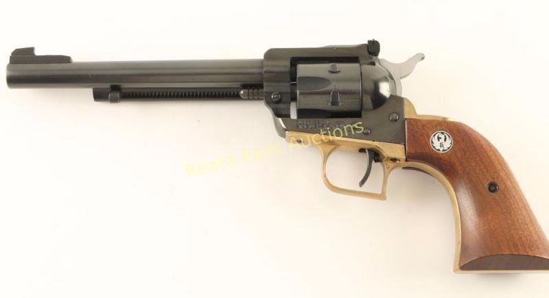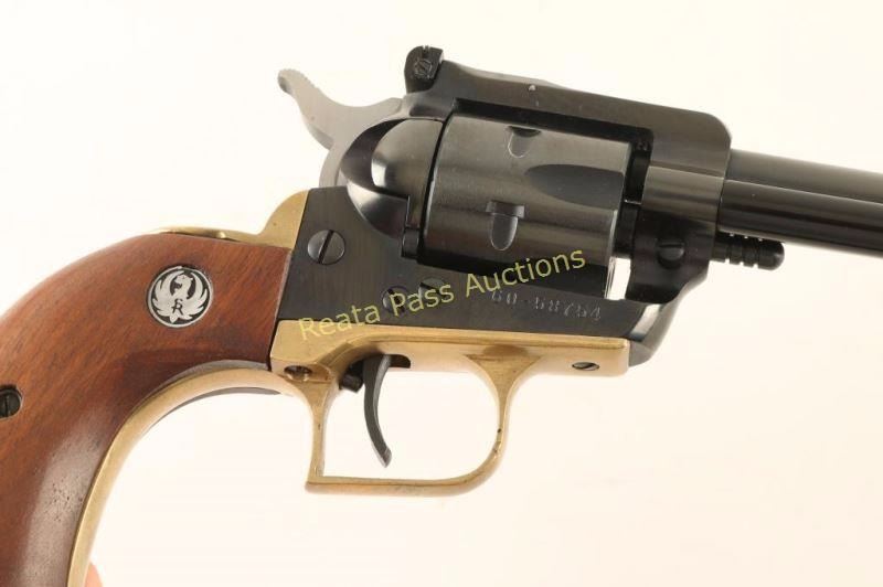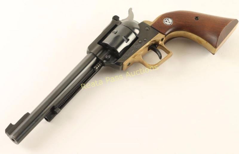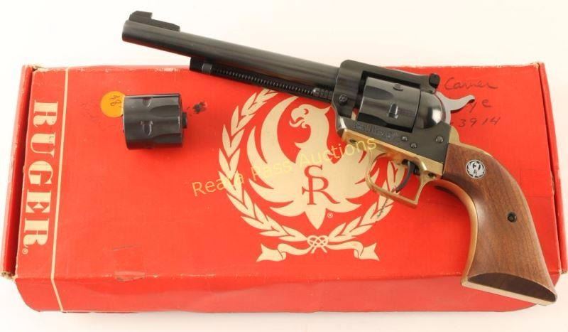 American single action revolver chambered in .22 Magnum, circa 1971. Features a blued finish, 6.5" barrel, raised patridge front sight, adjustable rear window sight, fluted six shot cylinder, ejector rod, three-screw flat-top frame, transfer bar safety, serrated hammer spur & wide trigger, brass grip frame & trigger guard, and two-piece Ruger medallion smooth walnut grips. Includes a .22 LR conversion cylinder and a factory red cardboard box for a New Model Single-Six. Revolver retains approximately 95% of it's original finish showing light holster wear, a drag line and some very light scattered surface rust on the cylinder. The front sight is slightly buggered, the brass frame shows some minor imperfections and the conversion cylinder shows a wear pattern with chatter marks on the right side of the cylinder stop flutes. Action is crisp, bore is pristine, and grips are near fine. Condition is very good in box. ***Modern Firearm***