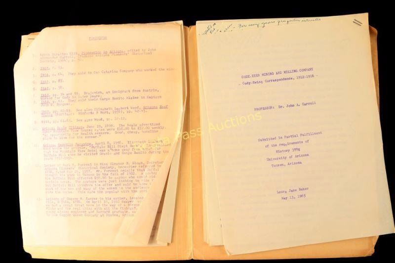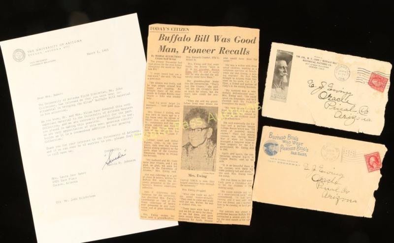 Interesting lot of envelopes and documented correspondence, both addressed by Cody to E.J. Ewing a mining engineer who worked for Cody and (3) typed copies of 1965 college paper Cody/Dyer Mining & Milling Co. 1912-1916 envelopes. (1) envelope which has Buffalo Bills Wild West combined with Pawnee Bill Far East return address from his New York Office 1261 Broadway, and the other is from Colonel W.F. Cody historical pictures Denver, CO and stamped from the post office in Chicago, Il. dated Jan. 24, 1914. Also a letter from Marvin Johnson to Mrs. Baker who was a field historian for U of Arizona, Tucson who was talking about the wife of Ewing.