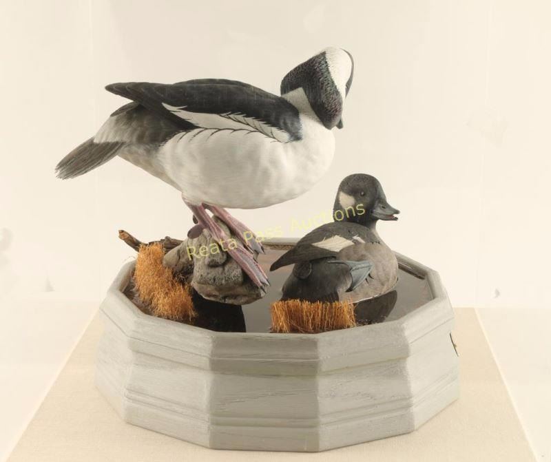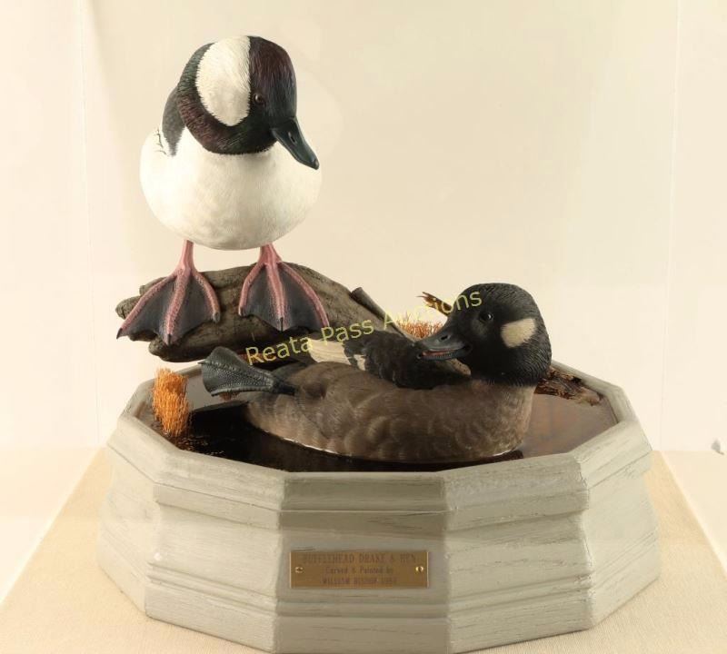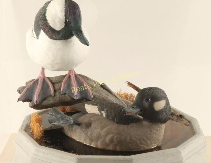 "Bufflehead Drake & Hen" Drake is perched on a log with grass behind it while the hen swims below in resin water. Sculpture sits on painted wood base in plexiglass box. Very lifelike with great attention to detail. Measures 17 1/2"x16"x17 1/2". William Bishop is a wildlife artist who works in the medium of wood. Each sculpture is an original, detailed carving representing various species of waterfowl. Using natural wood, William brings out the beauty and grain, creating a unique and stunning piece of art. William was introduced to wildlife carving in 1983 when he attended a fund-raising dinner sponsored by Duck’s Unlimited. He was so impressed with wildlife sculpture and the people involved in this realm he began studying books on the subject acquiring a great admiration for this form of art. The dining room in his Santa Monica, California apartment was transformed into an artist studio. He has always wanted to work with wood and in 1986 he took a leap of faith, quit his job at UCLA, and began carving professionally. He did well in competitions, winning many blue ribbon and best of show awards in carving exhibitions throughout the United States. That very next year he was honored with the first place award in Life-Size Decorative Waterfowl category at the Ward Brothers World Championship held in Ocean City, Maryland.