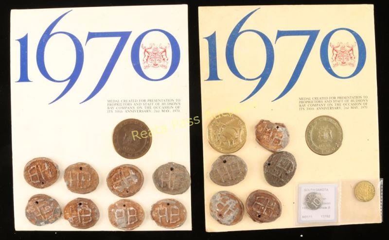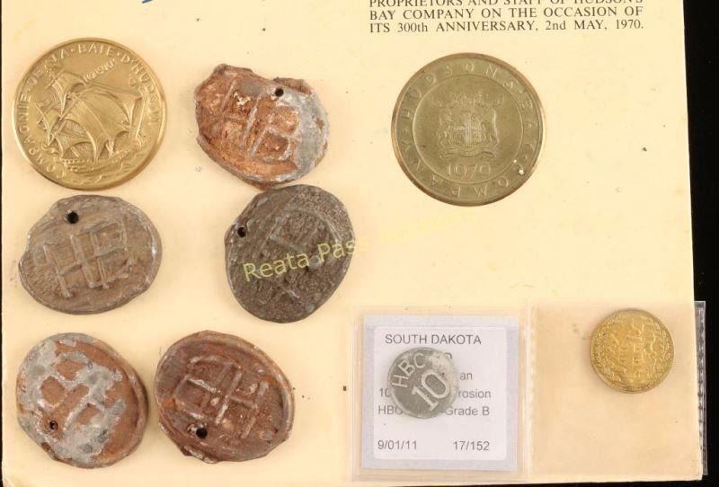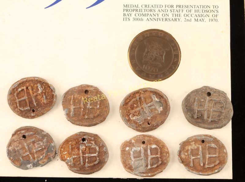 3 Hudson Bay 300th Anniversary medals, 1 HB 1855 1/4 beaver coin, 1 HB ten coin, late century type and 13 beaver bale tags.