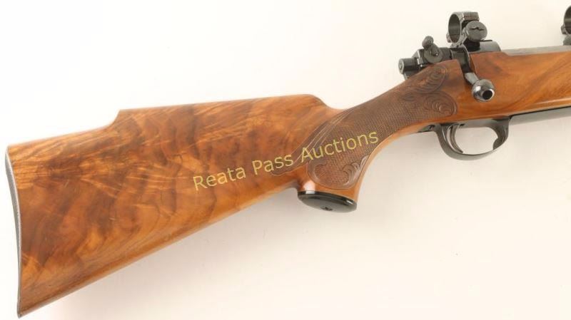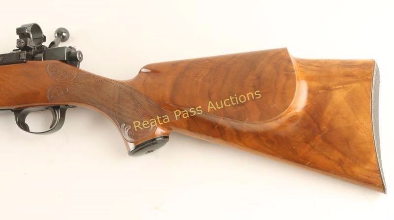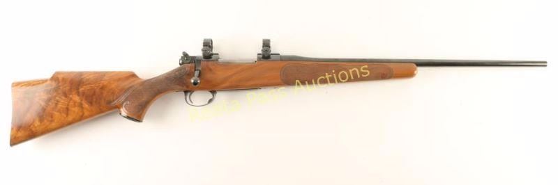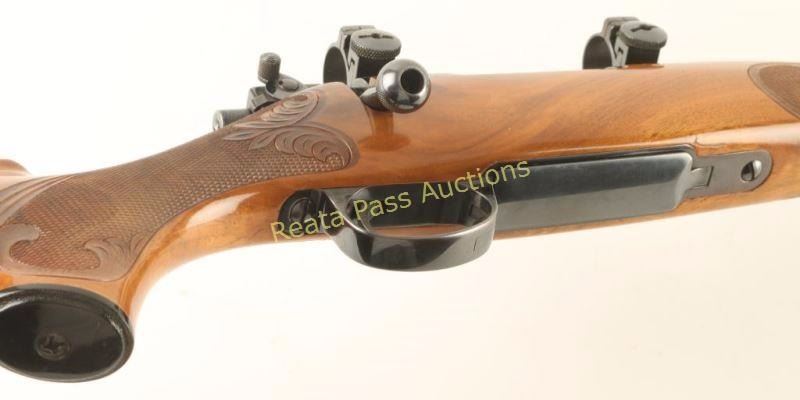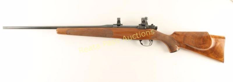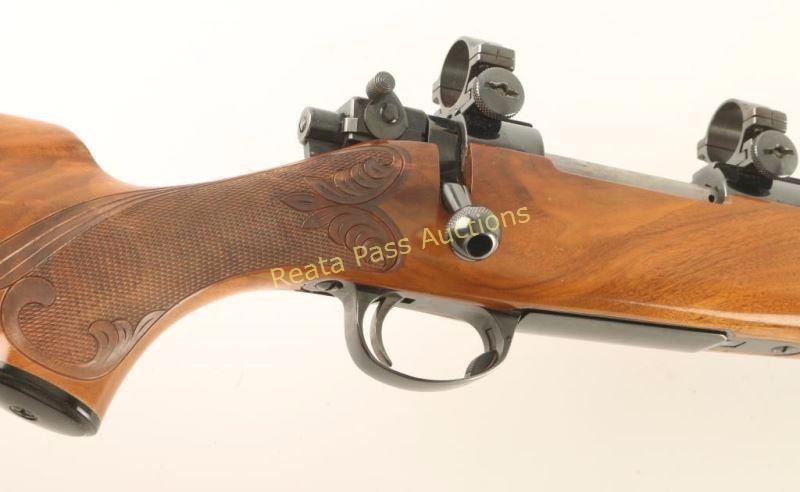 Finely customized Finnish made bolt action sporting rifle chambered in .22-250 Remington. Features a blued finish, floated 21" Atkinson & Marquart Rifle Co. barrel with no provisions for sights, Sako L57 receiver with Sako ring, manual safety, integral box magazine with hinged floorplate, serrated trigger and checkered Monte Carlo style shock with beautiful hand carved embellishments & checkered metal buttplate. Rifle retains approximately 97% of it's blued finish showing a few small losses on the barrel, light wear on the trigger guard and a few freckles of surface rust observed on both the barrel & receiver. Action is smooth, bore is pristine and wood stock is very good++ showing some minor dings & scratches. Condition is near excellent. ***Modern Firearm***