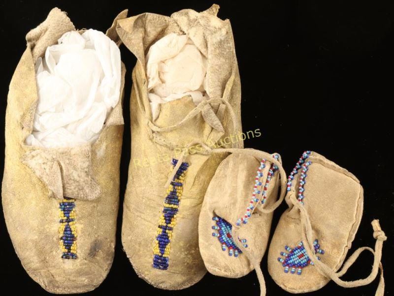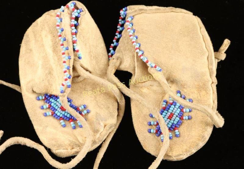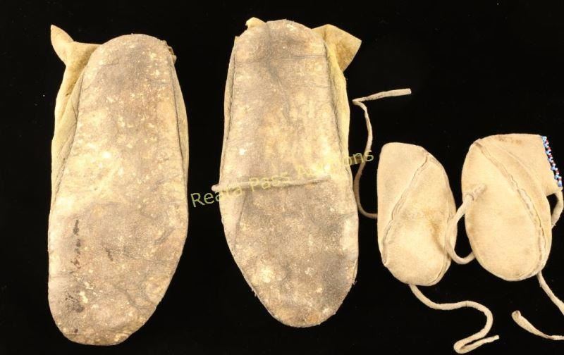 Included is a pair of very small baby moccasins, leather accented with blue trade bead geometric pattern. Also included is a larger pair of child's moccasins, leather construction. Toe shows yellow and blue design. Condition for both is overall good, both show age.
