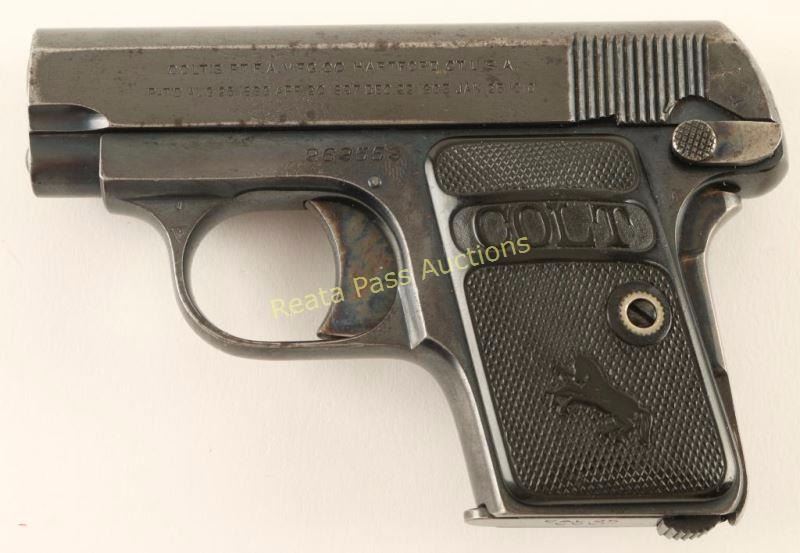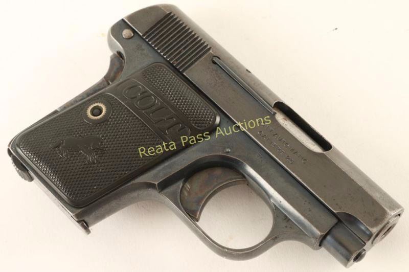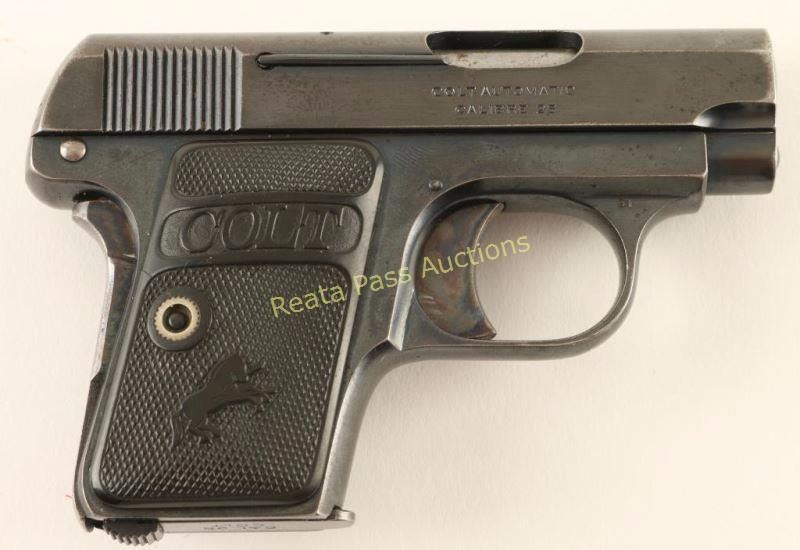 Vintage semi automatic pocket pistol chambered in .25 Automatic Colt Pistol, circa 1920. Features a blued & case hardened finish, 2" barrel, fixed sights, serrated slide, grip safety, manual thumb safety, 6 round two-tone magazine and black Rampant Colt checkered hard rubber grips. Pistol retains approximately 80% of its blued finish & 75% of its case colors showing edge wear, handling marks and small amount of light scattered surface rust. Action is strong, bore appears good but is dirty and grips are fine. Condition is very good+. **C&R Firearm** **Modern Firearm**