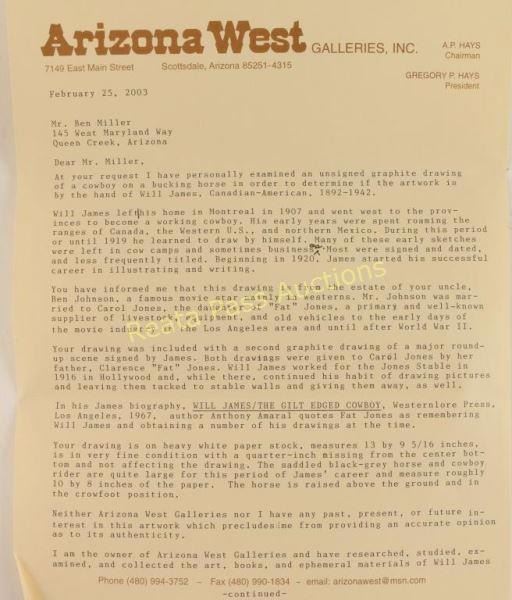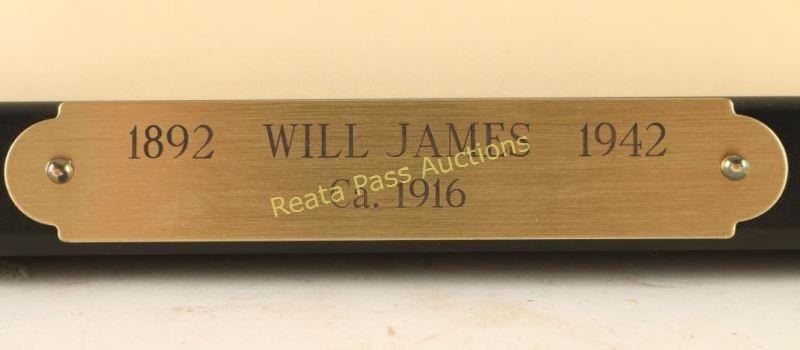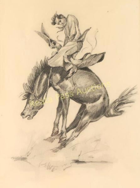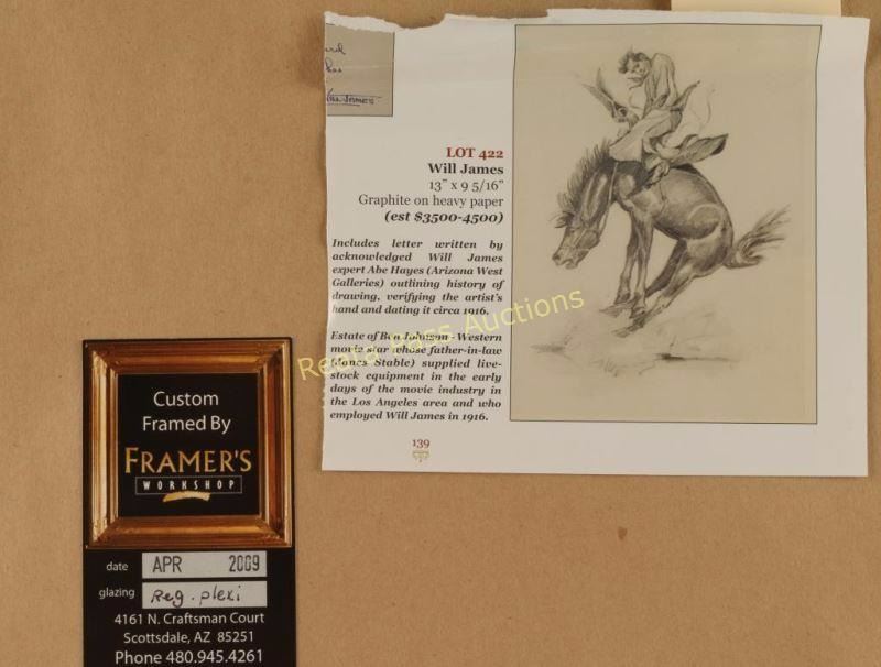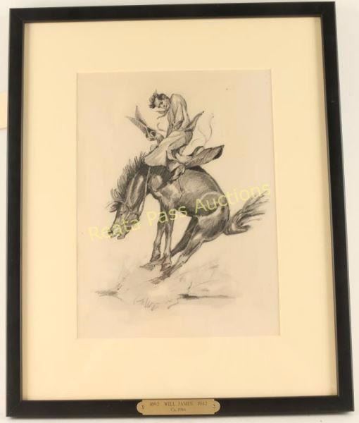 Depicting bronc rider, image measures 9"x11 1/2" with mat and black wood frame. Brass plaque on frame reads ' 1893 Will James 1942, Ca. 1916". Includes letter written by acknowledged Will James expert Abe Hayes (Arizona West Galleries) outlining history of drawing, verifying the artist's hand and dating it circa 1916. Estate of Ben Johnson-Western movie star whose father in law (James Stable) supplied livestock equipment in the early days of the movie industry in the Los Angeles area ad who employed Will James in 1916. Will James, cowboy, cattle rustler, and beloved author and artist of the American West was born in Quebec, Canada. He came West at the age of fifteen and became a cowhand showing artistic talent from an early age, gaining a reputation for his sketches of life on the range. Between 1920 and his death in 1942 Will James wrote and illustrated more than twenty books and numerous magazine articles. The Will James Society promotes his legacy, literature, and art, and donates his books to schools and libraries throughout the United States and Canada. They also send softcover versions to military installations in the US and overseas. The society is currently located in Elko, Nevada which is also the home of the Northeastern Nevada Museum, the home of Don Frazier's collection of art works and books by Will James.From the Bill A. Gary estate Prescott, AZ.