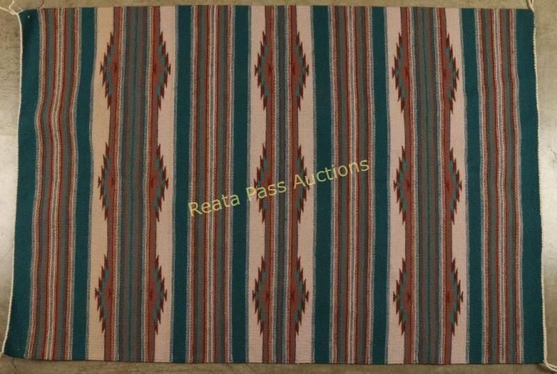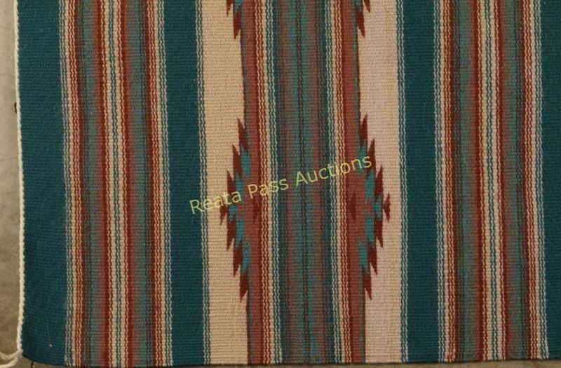 Teal, brown and tan very tightly woven by Lucille Begay. Purchased from the Teec Nos Pos Trading Post in 1987. Measures 47"l x 31 1/2"w.