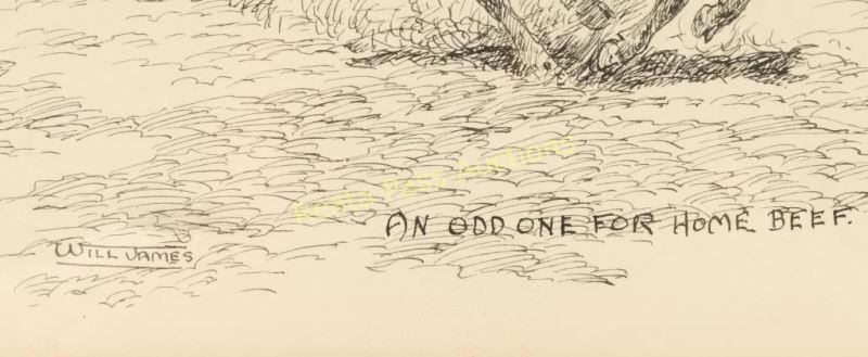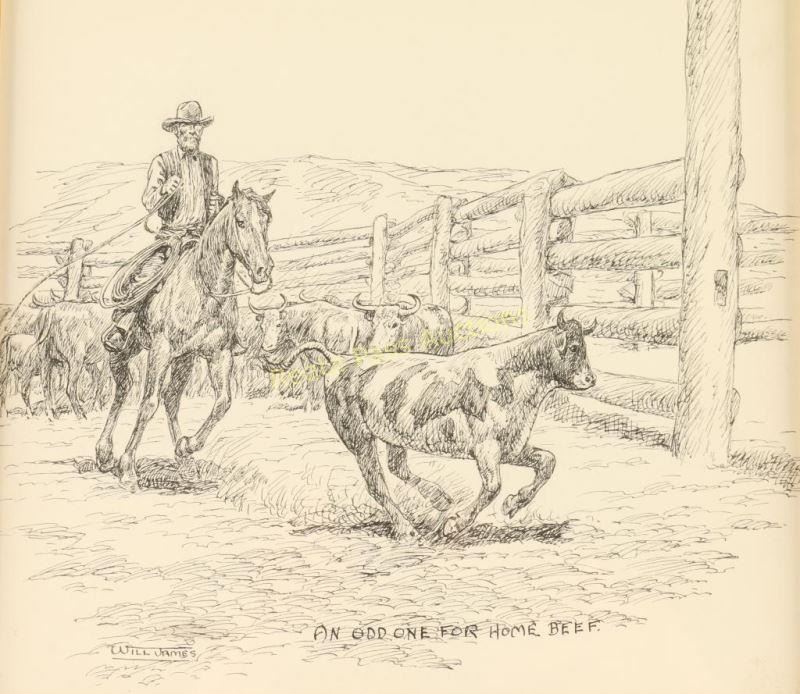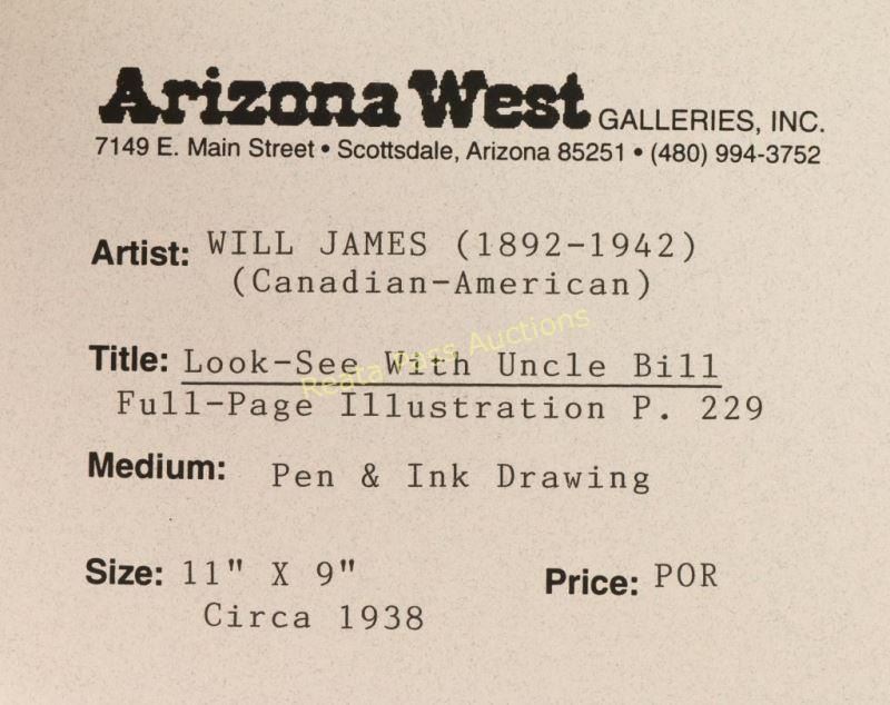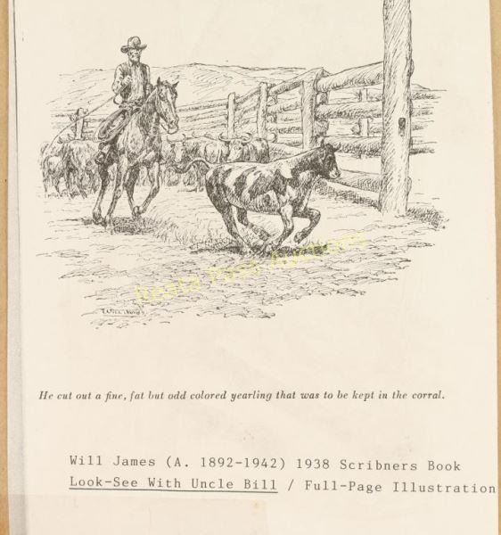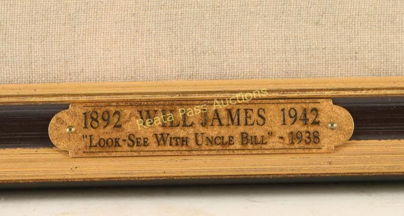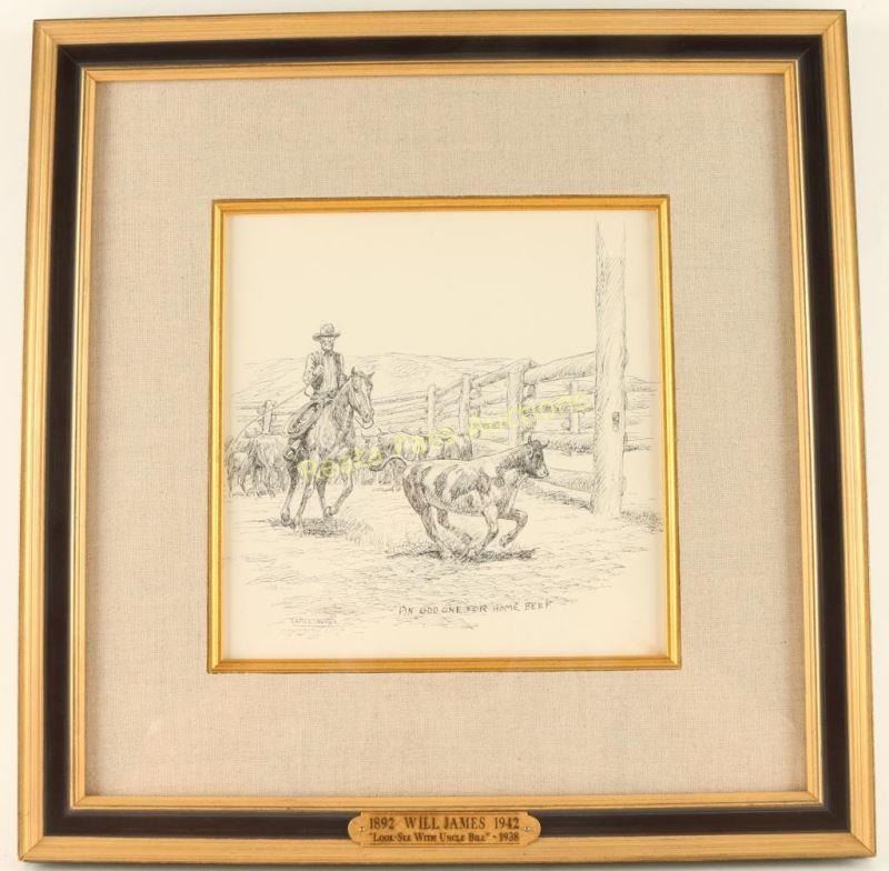 Entitled "Look-See with Uncle Bill" with 'An odd one for home beef' written on drawing. Image measures 8 1/2"x 8 1/2" nicely framed with gold fillet, linen mat and gold and brown wood frame. Brass plaque on frame reads '1892 Will James 1942, "Look-See With Uncle Bill-1938". In 1938 Scribners full page illustration p.229. Will James, cowboy, cattle rustler, and beloved author and artist of the American West was born in Quebec, Canada. He came West at the age of fifteen and became a cowhand showing artistic talent from an early age, gaining a reputation for his sketches of life on the range. Between 1920 and his death in 1942 Will James wrote and illustrated more than twenty books and numerous magazine articles. The Will James Society promotes his legacy, literature, and art, and donates his books to schools and libraries throughout the United States and Canada. They also send softcover versions to military installations in the US and overseas. The society is currently located in Elko, Nevada which is also the home of the Northeastern Nevada Museum, the home of Don Frazier's collection of art works and books by Will James. From the Bill A. Gary estate Prescott, AZ.