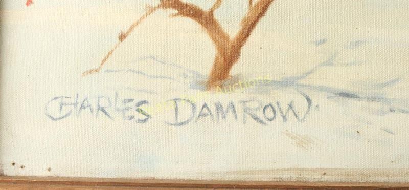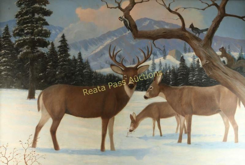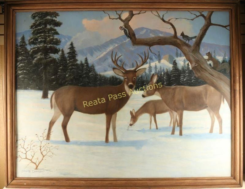 By Charles Damrow. Depicting Deer in the Snow. Signed in lower left hand corner. Image size is 58" W x 46" H in pine frame.