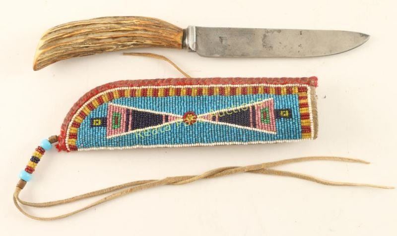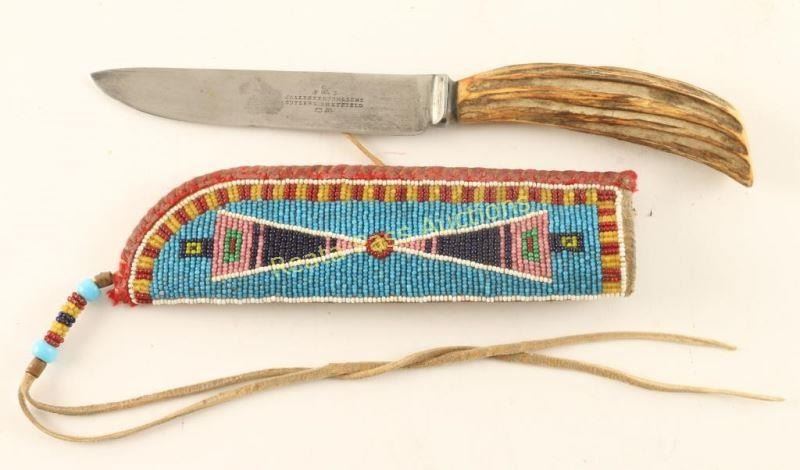 Joseph Fenton& Son knife with stag handle 9 1/2" overall with a 5"blade. Includes a beautifully full beaded sheath with seed beads in a geometric pattern, shows age, good condition overall.