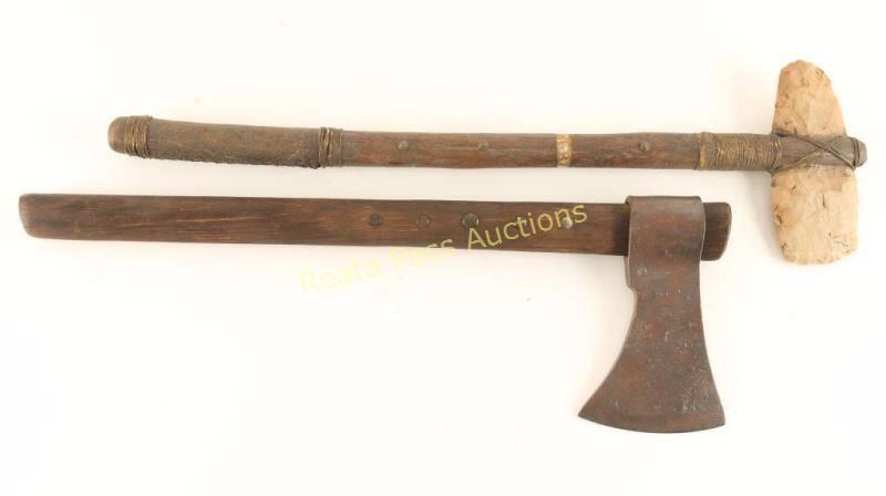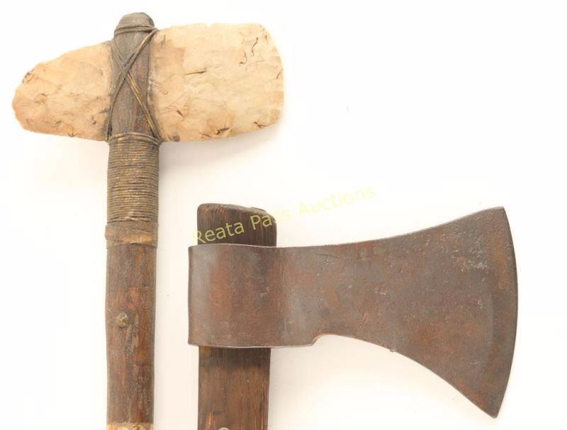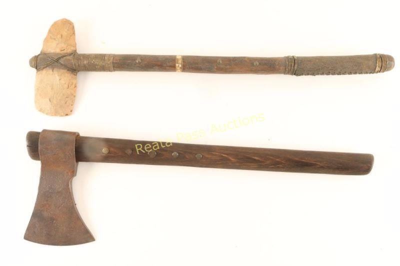 1 Repro war club tomahawk with wood handle and brass tack design, rawhide wrap with stone blade. 1 older tomahawk with wooden handle with brass tacks and aged metal blade.