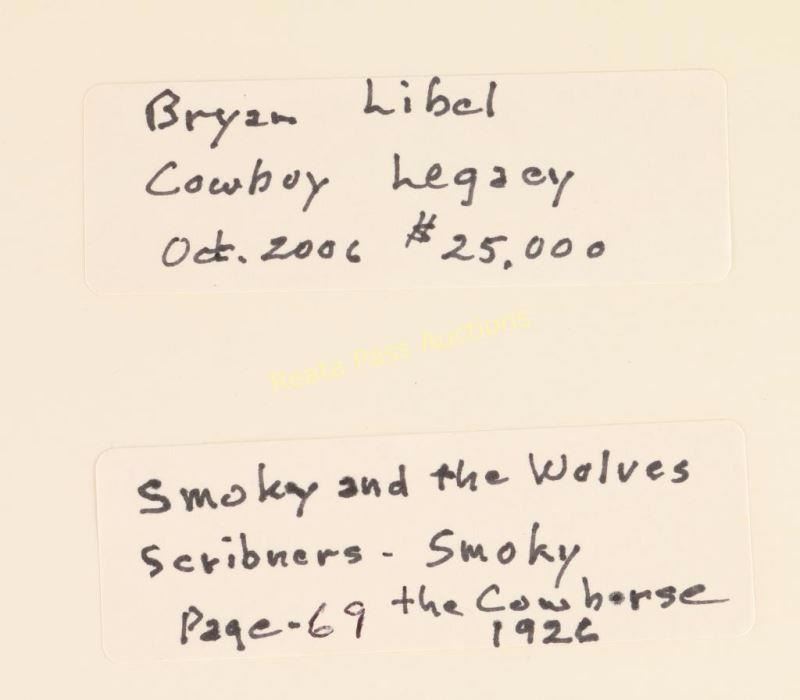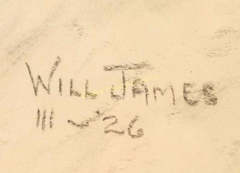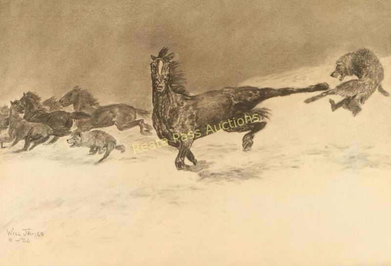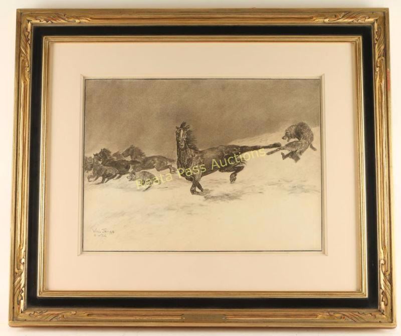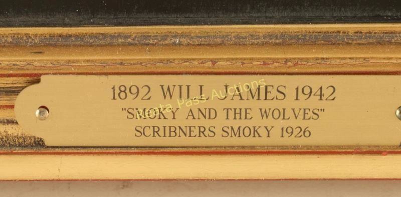 Entitled "Smoky and the Wolves", image measures 19 1/2"x14 1/2" with single mat and fancy gold and black wood frame. In Scribners 1922 issue Smoky the Cowhorse page 69. Purchased in October 2006 for $25,000. Will James, cowboy, cattle rustler, and beloved author and artist of the American West was born in Quebec, Canada. He came West at the age of fifteen and became a cowhand showing artistic talent from an early age, gaining a reputation for his sketches of life on the range. Between 1920 and his death in 1942 Will James wrote and illustrated more than twenty books and numerous magazine articles. The Will James Society promotes his legacy, literature, and art, and donates his books to schools and libraries throughout the United States and Canada. They also send softcover versions to military installations in the US and overseas. The society is currently located in Elko, Nevada which is also the home of the Northeastern Nevada Museum, the home of Don Frazier's collection of art works and books by Will James.From the Bill A. Gary estate Prescott, AZ.