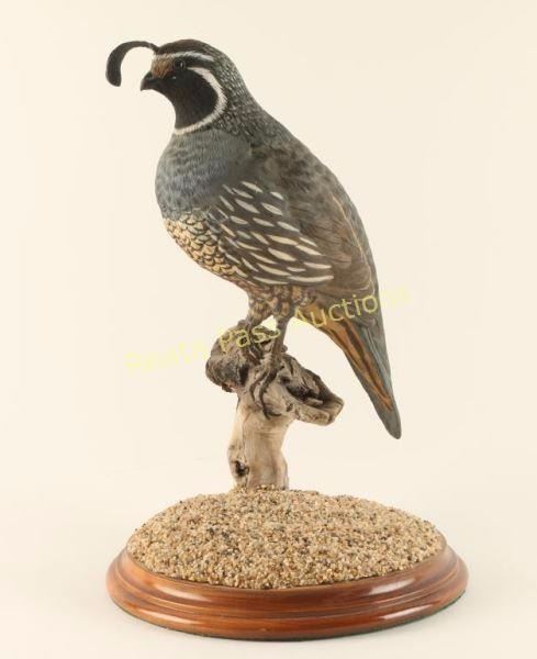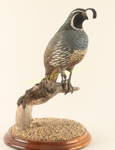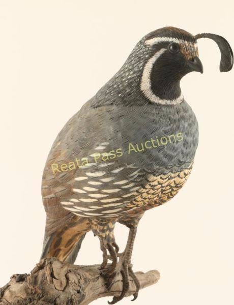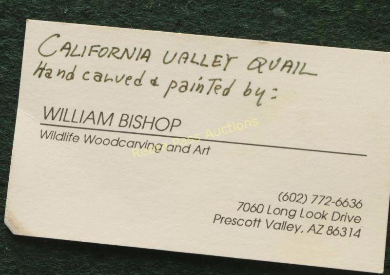 "California Valley Quail" hand carved and painted with great attention to detail. Quail sits on branch with pebbled surface below on wood base. Measures 7 1/2" dia. base 11"h, head plume is broken. William Bishop is a wildlife artist who works in the medium of wood. Each sculpture is an original, detailed carving representing various species of wildlife. Using natural wood, William brings out the beauty and grain, creating a unique and stunning piece of art. William was introduced to wildlife carving in 1983 when he attended a fund-raising dinner sponsored by Duck’s Unlimited. He was so impressed with wildlife sculpture and the people involved in this realm he began studying books on the subject acquiring a great admiration for this form of art. The dining room in his Santa Monica, California apartment was transformed into an artist studio. He has always wanted to work with wood and in 1986 he took a leap of faith, quit his job at UCLA, and began carving professionally. He did well in competitions, winning many blue ribbon and best of show awards in carving exhibitions throughout the United States. That very next year he was honored with the first place award in Life-Size Decorative Waterfowl category at the Ward Brothers World Championship held in Ocean City, Maryland.