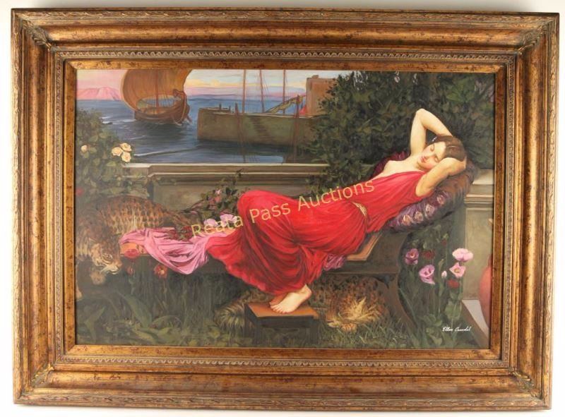 Beautifully framed painting depicting a reclining, partially nude woman in a red dress with two cougars at her feet. Measures 42 1/2" x 35 1/2"
