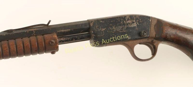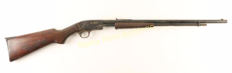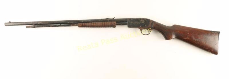 Vintage slide action porting rifle chambered in .22 Short, Long or Long Rifle, circa 1929-1932. Features a black painted finish, 24" octagonal barrel, blade front sight, rear sporting sight(missing ramp(, take-down receiver, drilled & tapped upper tang, 3/4 length tube magazine, smooth trigger, push button safety, grooved walnut slide handle and pistol grip shoulder stock with ill-fitting crescent metal buttplate. Rifle retains approximately 70% of it's painted finish with the balance exhibiting surface rust. Action appears to be in good working order, bore is near excellent showing a ring near the muzzle and wood stocks are fair. Condition is fair. ***C&R Firearm*** ***Modern Firearm***