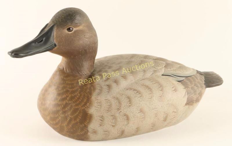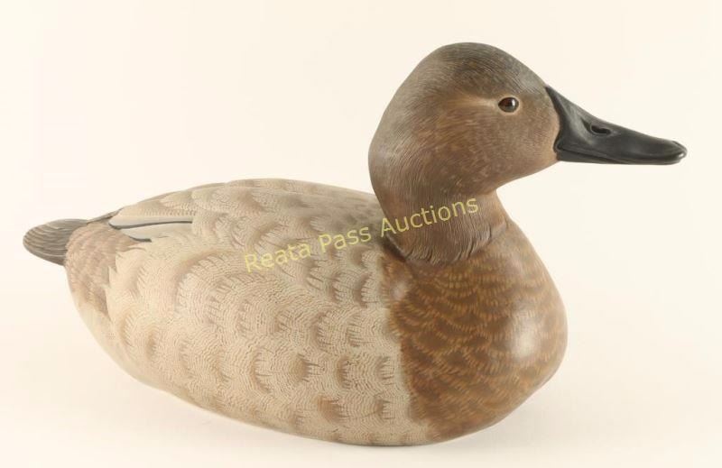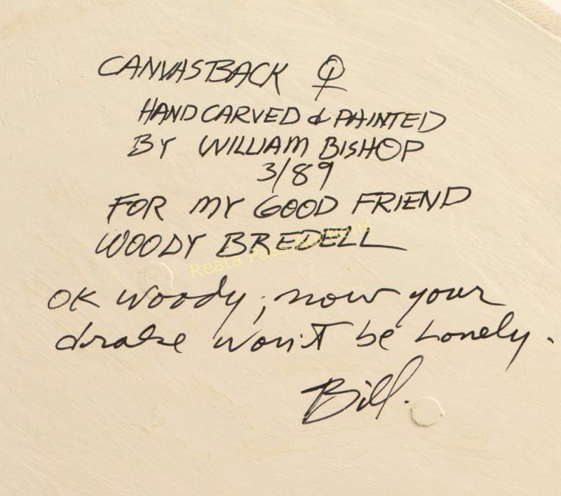 Canvasback duck carved and hand painted, very lifelike with great attention to detail. Signed on bottom by artist.. Measures 13"x7"x6 1/2". William Bishop is a wildlife artist who works in the medium of wood. Each sculpture is an original, detailed carving representing various species of wildlife. Using natural wood, William brings out the beauty and grain, creating a unique and stunning piece of art. William was introduced to wildlife carving in 1983 when he attended a fund-raising dinner sponsored by Duck’s Unlimited. He was so impressed with wildlife sculpture and the people involved in this realm he began studying books on the subject acquiring a great admiration for this form of art. The dining room in his Santa Monica, California apartment was transformed into an artist studio. He has always wanted to work with wood and in 1986 he took a leap of faith, quit his job at UCLA, and began carving professionally. He did well in competitions, winning many blue ribbon and best of show awards in carving exhibitions throughout the United States. That very next year he was honored with the first place award in Life-Size Decorative Waterfowl category at the Ward Brothers World Championship held in Ocean City, Maryland.