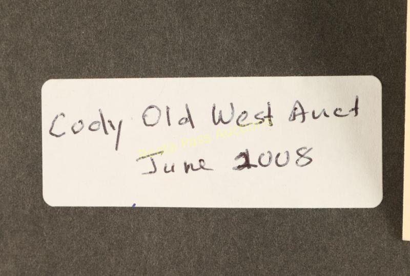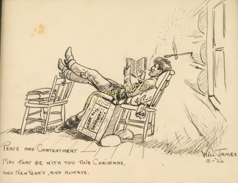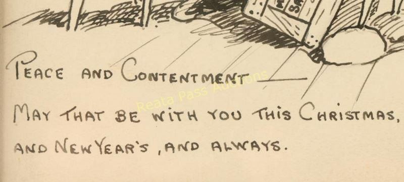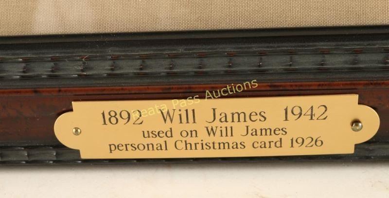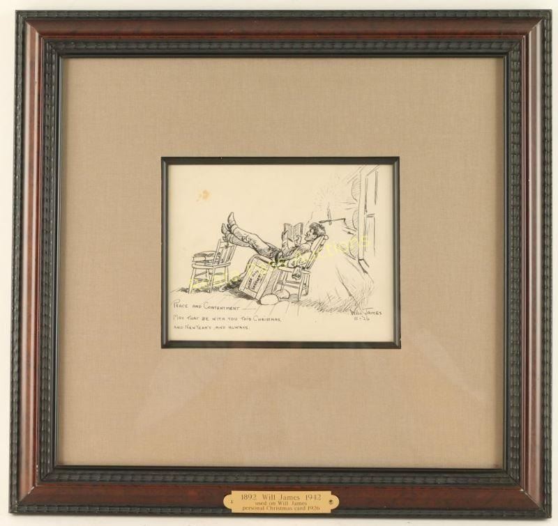 Entitled "Peace and Contentment" signed lower right with 'Peace and Contentment May That Be With You This Christmas, And New Years, And Always'. Image measures 7"x5 1/2" in single linen mat with black fillet and molded wood frame. Brass plaque on frame reads '1892 Will James 1942, used on Will James personal Christmas card 1926'. Purchased from the Cody Old West Auction in 2008. Will James, cowboy, cattle rustler, and beloved author and artist of the American West was born in Quebec, Canada. He came West at the age of fifteen and became a cowhand showing artistic talent from an early age, gaining a reputation for his sketches of life on the range. Between 1920 and his death in 1942 Will James wrote and illustrated more than twenty books and numerous magazine articles. The Will James Society promotes his legacy, literature, and art, and donates his books to schools and libraries throughout the United States and Canada. They also send softcover versions to military installations in the US and overseas. The society is currently located in Elko, Nevada which is also the home of the Northeastern Nevada Museum, the home of Don Frazier's collection of art works and books by Will James. From the Bill A. Gary estate Prescott, AZ.