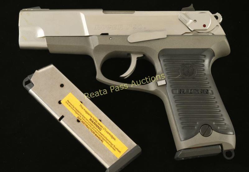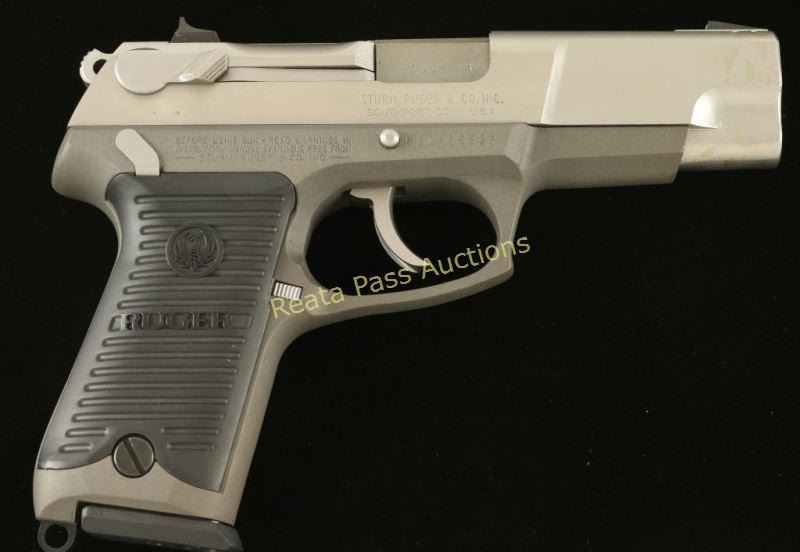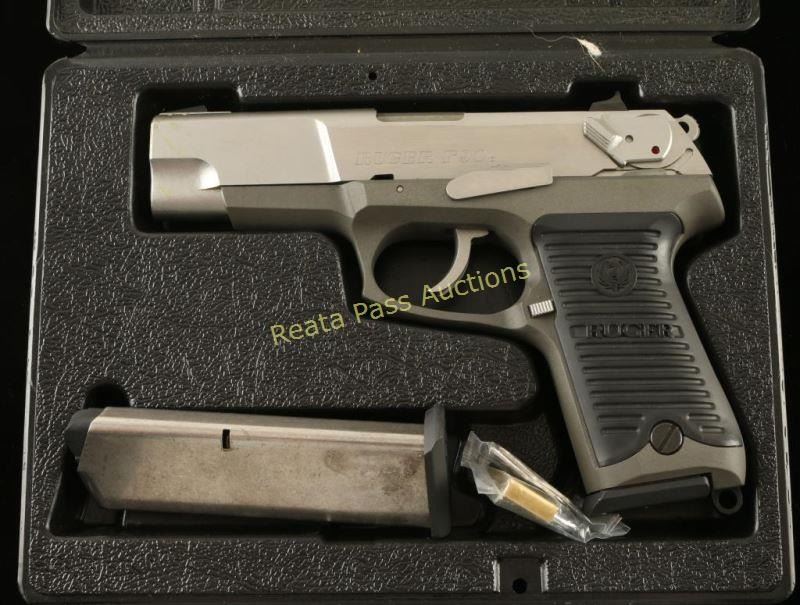 Full size double action semi-automatic pistol chambered in .45 Automatic. Features a stainless steel slide, 4.5" barrel, patridge front sight, drift-adjustable rear window sight, ambidextrous safety/decocker lever, push button magazine release, smooth trigger, serrated hammer spur, 7 round magazine, matte grey finished alloy frame, and two-piece Ruger grooved black polycarbonate grips. Includes the original factory hard case with documents, lock and extra magazine. Pistol exhibits little to no visible wear. Action is smooth, bore is pristine and grips are fine. Likely unfired. Condition is like new in case. ***Modern Firearm***