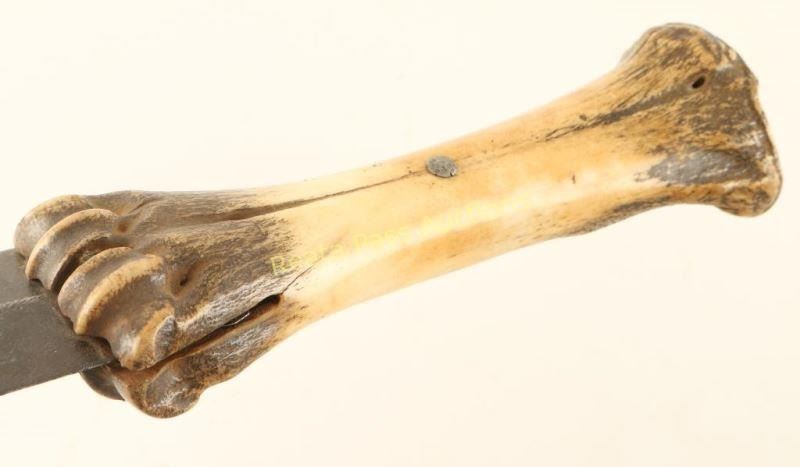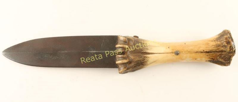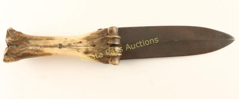 19th century type with a calf buffalo knuckle bone handle, Sheffield Trade blade. Absolutely stunning Indian dag originating from a private Texas musuem/collection. This knife is possibly southeast Apache. The real deal for a Native American collector or museum. Measures 15" overall with a 8" blade.