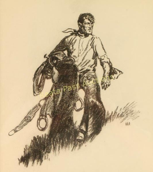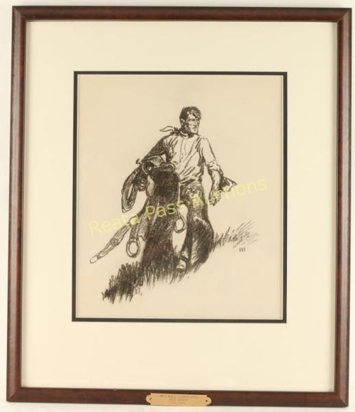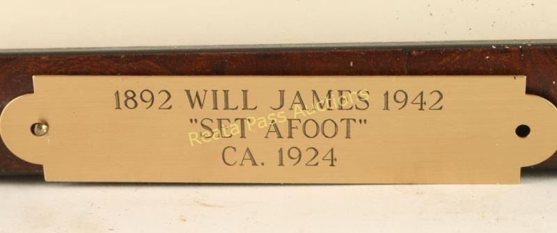 Entitled "Set Afoot", image measures 11"x13" in double mat and wood frame. Brass plaque on frame reads '1892 Will James 1942, "Set A foot" CA. 1924'. Purchased at High Noon Auction in 2008 for $8000. Will James, cowboy, cattle rustler, and beloved author and artist of the American West was born in Quebec, Canada. He came West at the age of fifteen and became a cowhand showing artistic talent from an early age, gaining a reputation for his sketches of life on the range. Between 1920 and his death in 1942 Will James wrote and illustrated more than twenty books and numerous magazine articles. The Will James Society promotes his legacy, literature, and art, and donates his books to schools and libraries throughout the United States and Canada. They also send softcover versions to military installations in the US and overseas. The society is currently located in Elko, Nevada which is also the home of the Northeastern Nevada Museum, the home of Don Frazier's collection of art works and books by Will James.From the Bill A. Gary estate Prescott, AZ.