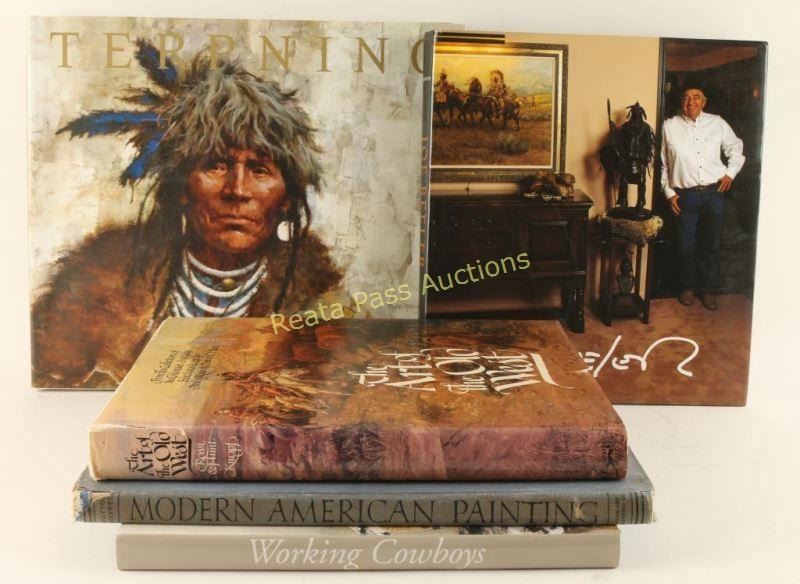 Including: "Mark Kohler Working Cowboys and Other Watercolors from My Western Travels" signed by author, "Art of the Old West" From the collection of the Gilcrease Institute, "Modern American Painting" by Peyton Boswell Jr., "Terpning Tribute to the Plains People" Text by Harley Brown, and "Joe Beeler Life of a Cowboy Artist" by Don Hedgpeth.