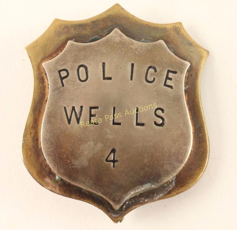 Wells #4 Nevada law badge measuring 1 9/16" dia. Round silver Mexican peso with cut out star in center.
