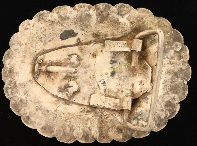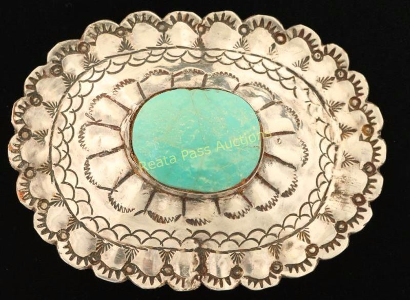Sterling plated, stamped belt buckle with a large turquoise cab. Measures 4" x 3 1/2". Unsigned. Very heavy. Could be solid sterling but appears to be plated.