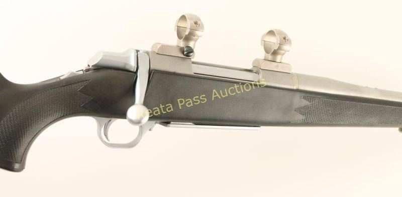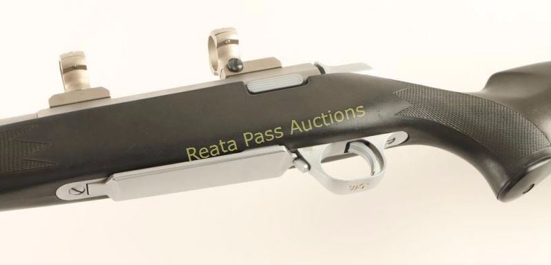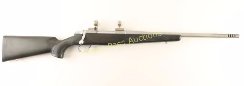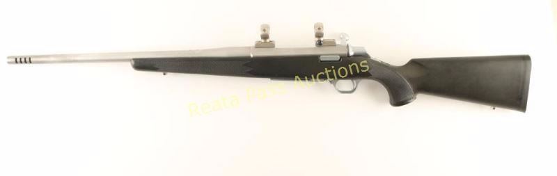 Japanese made stainless steel bolt action sporting rifle chambered in .375 Holland & Holland Magnum. Features a satin finish, floated 21" barrel with integral muzzle break, provisions for sights, scope bases & rings, sliding tang safety, cocked indicator, hinged floorplate with removable magazine, swivel studs and checkered black synthetic pistol grip stock with rubber recoil pad. The barrel's finish from the rear sight taps forward has a brushed finish rather than a bead blasted matte finish, and also has some rub marks making those areas bright. Action is smooth, bore is excellent and synthetic stock is fine. Condition is very good+. ***Modern Firearm***