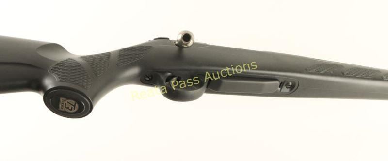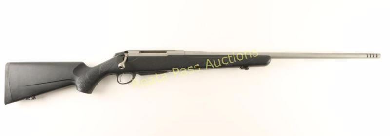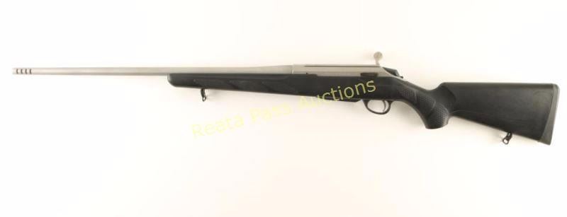 'T3 Lite' Finnish made stainless steel bolt action sporting rifle chambered in 7mm Remington Magnum. Features a satin finish, floated 24.5" barrel with integral muzzle break, no provisions for sights, drilled & tapped receiver with integral scope ring cuts, manual safety, cocked indicator, detachable magazine, quick release sling swivels, 2-lug bolt, single stage adjustable trigger, and ergonomic black synthetic stock with rubber recoil pad. Includes the original factory box with rings. Rifle exhibits very little use or wear but the finish on the upper portion of the barrel differs slightly from the rest of the rifle, likely something to do with the installation of the muzzle break. Action is very smooth, bore is pristine and synthetic stock is fine. Rifle is likely unfired. Condition is near new. ***Modern Firearm***