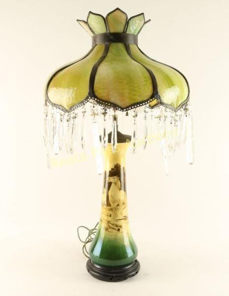 Ceramic yellow and green base which shows two running horses by Royal Doulton. Green stained glass shade with hanging crystals. From the Larry Howard Estate.