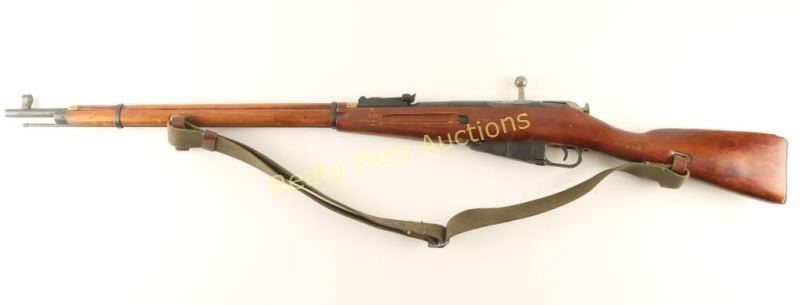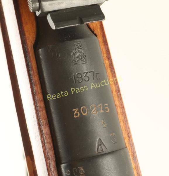 Russian military bolt action service rifle chambered in 7.62x54Rmm, circa 1937. Imported by C.A.I. of Georgia, V.T. with import marks on the receiver. Featured a blued refinish, Izhevsk marked 28.7" tapered barrel, hooded post front sight, graduated rear sight to 2,000 meters, internal box magazine with hinged floorplate, straight bolt handle, two barrel bands, cleaning rod, canvas sling, smooth wood handguard and straight grip shoulder stock with metal buttplate. The floorplate, bolt and buttplate have electro-pencil serial numbers to match that of the barrel. Rifle exhinits approximately 95% of it's matte blued finish intact with light bayonet wear on the barrel and rust stains on the bolt. Action functions well, bore is dark with good rifling and wood stock is good showing a repair at the toe. Condition is good+. ***C&R Firearm*** ***Modern Firearm***