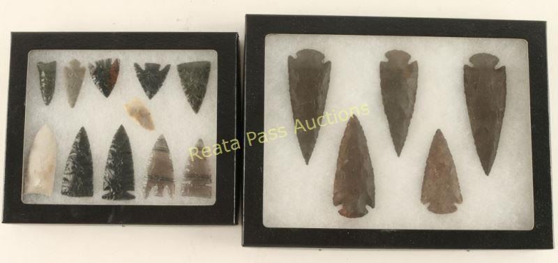 Unknown age or origin, in two Riker cases. One case has 5 arrowheads, the other has 11. Offered "as is", we don't guarantee the authenticity of this item, please do your research. All sales are final.