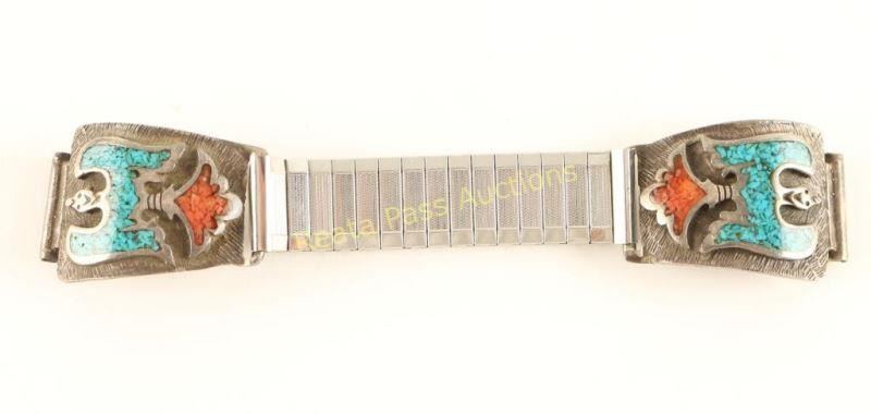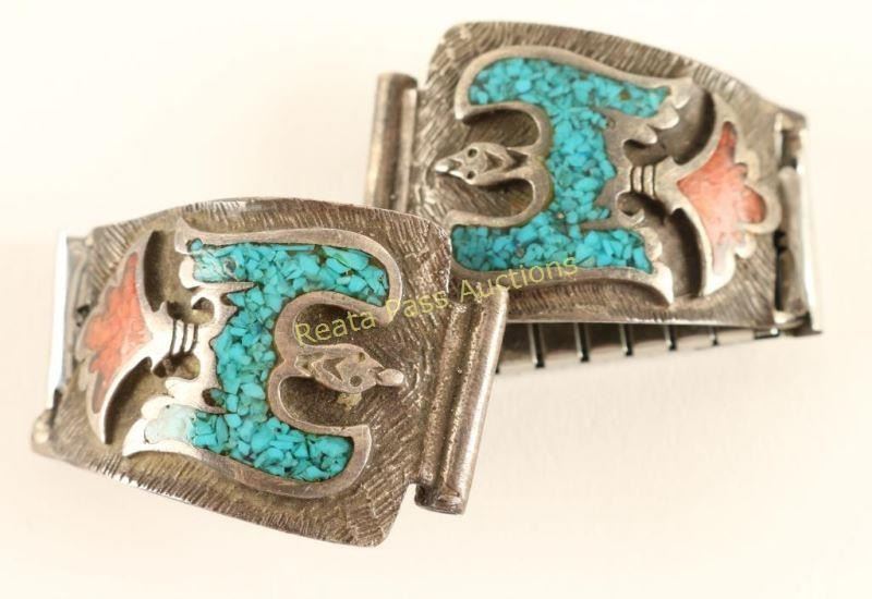 Eagle motif on each side is inlaid with turquoise and coral in sterling silver.