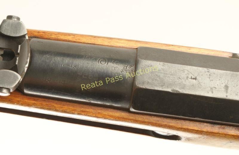 Sporterized American made bolt action service rifle chambered in 7.62x54Rmm, produced by the New England Westinghouse Co. circa 1915. Features a blued refinish, 22.5" barrel, 03-A3 style front sight, graduated rear sight to 3,200 meters, short bent bolt handle, integral box magazine with hinged floorplate, smooth trigger and straight grip wood shoulder stock with metal buttplate. Serial numbers are non-matching. Markings: Receiver - flaming bomb Barrel: - eagle head/X5, eagle head/X4 and eagle head/X2 marked twice. Rifle bears approximately 65& of it's blued refinish showing scattered pitting and oxidation. Action performs well, bore is dark with good rifling and wood stock is very good. Condition is fair. ***C&R Firearm*** ***Modern Firearm***