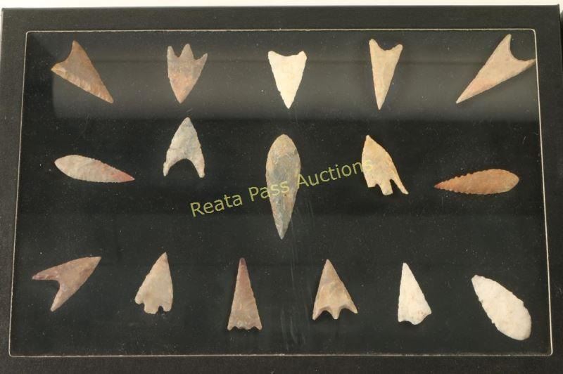 1 Riker case with Midwest arrowheads-per consignor, unknown age. 1 Riker case of Neolithic arrowheads 5,000+ years old per consignor, unknown origin 16 total. Offered "as is", we don't guarantee the authenticity of this item, please do your research. All sales are final.