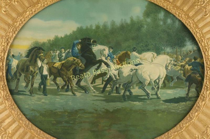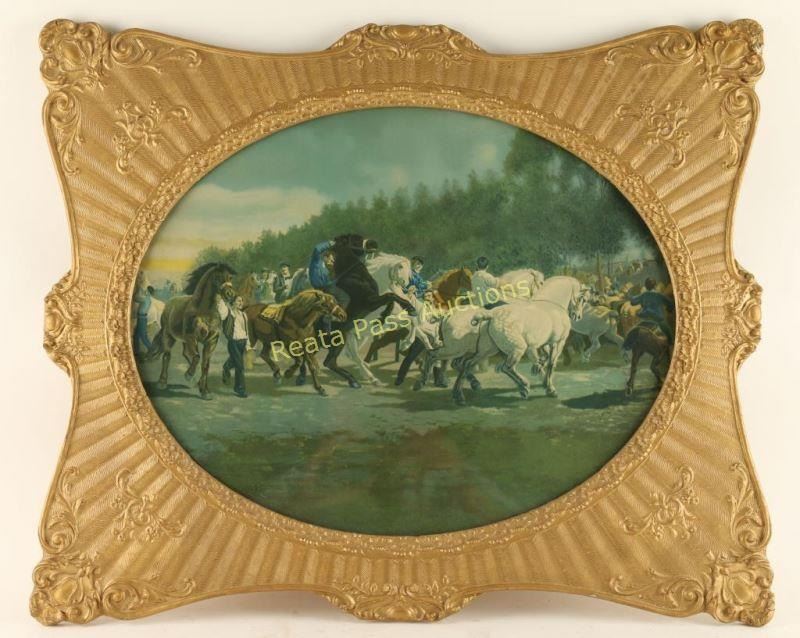 Unsigned depicting Lipizzan horses in a gold Victorian ornate frame. Measures 19"x15" oval. From the Larry Howard Estate.