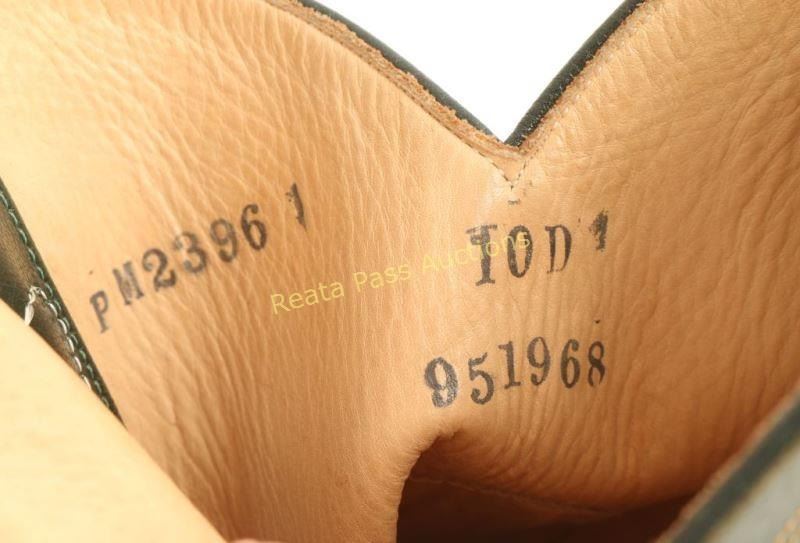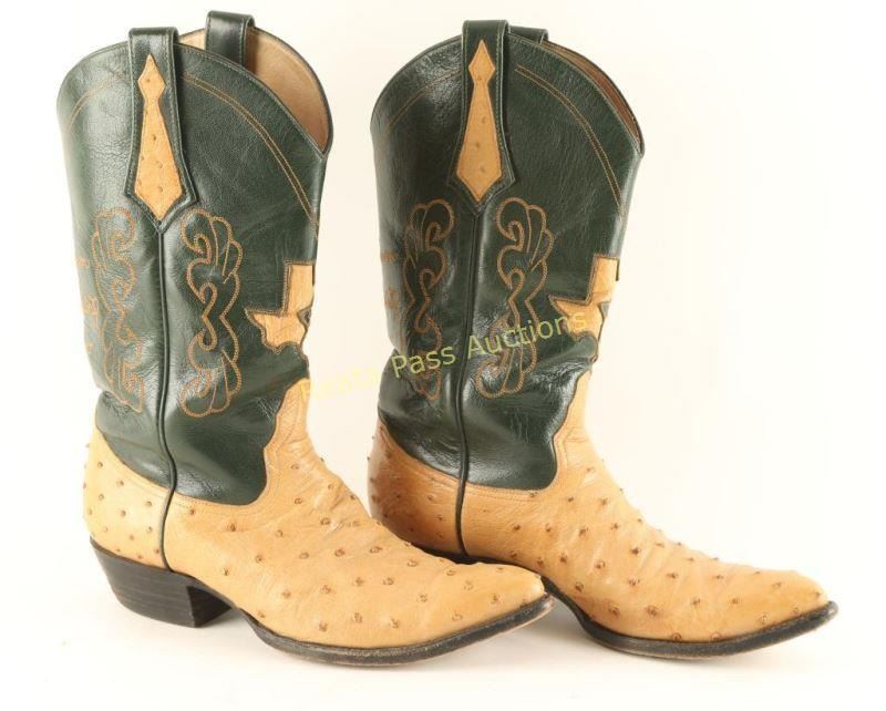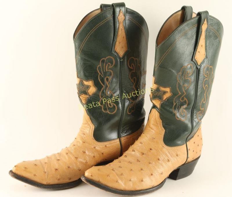 Fancy boots with tan ostrich lower and forest green shaft with a Texas cut-out star on the front that is stitched with '1995', on the back 'Ben Johnson Pro and Celebrity Rodeo'. Size 10D, show some wear otherwise good.