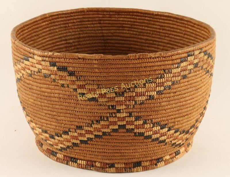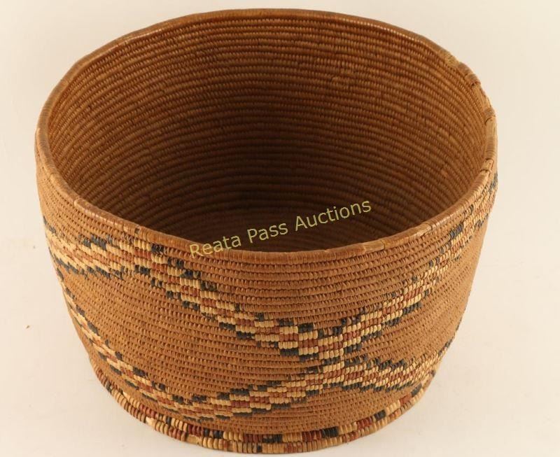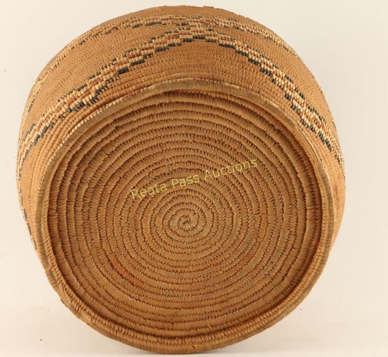 Geometric diamond pattern, very tightly woven well made basket. Measures 11 1/4" dia x 7" h. Condition is good with minor losses to rim and bottom, great deep patina. From an Oklahoma collector's estate.