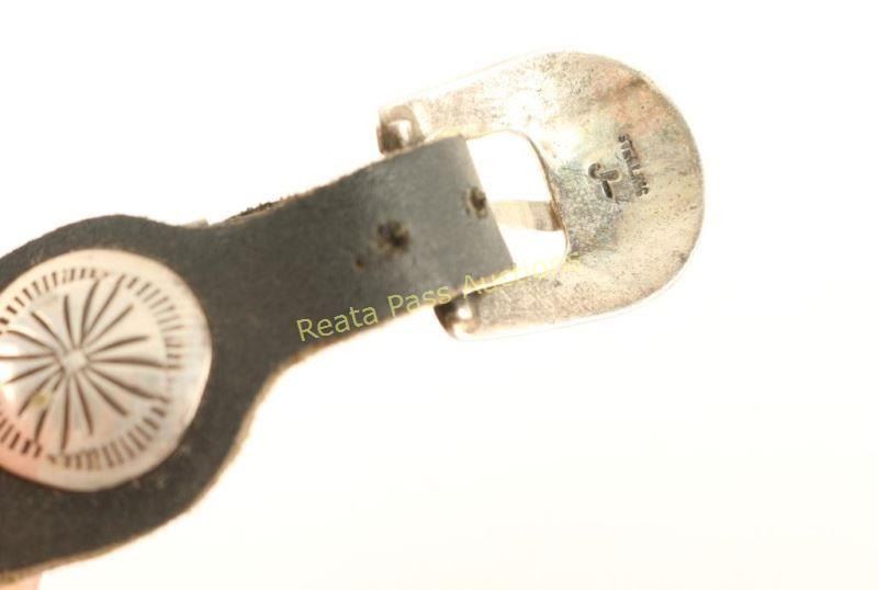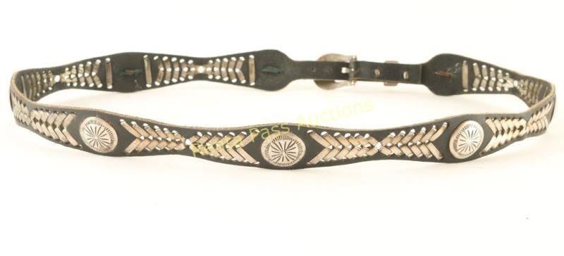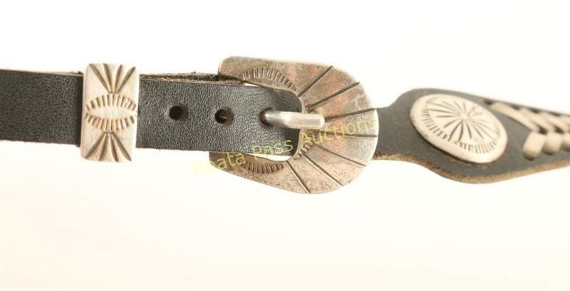 Black leather hat band with sterling conchos and buckle with a metal weaving design. Marked sterling on buckle.