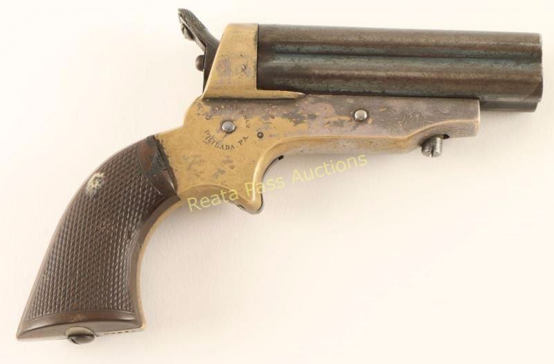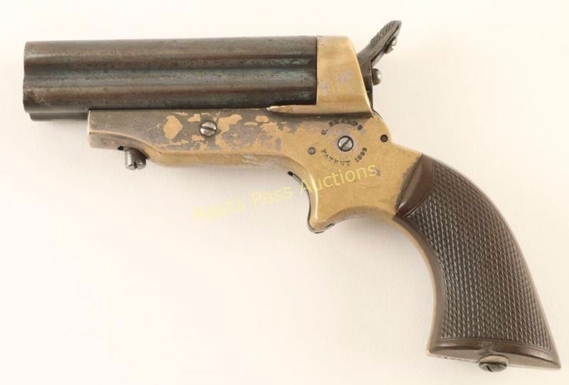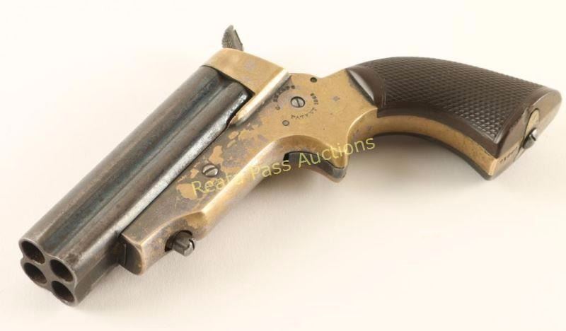 Four shot breech-loading pepperbox pistol chambered in .30 caliber rimfire, circa 1859 - 1874. Features four 3" blued barrels, front bead sight, v-notch rear sight, rotating firing pin on hammer, smooth spur trigger, silver plated brass frame with "C. Sharps Patent 1859" & C. Sharps & Co. Philada, PA." markings and nicely checkered one piece hardwood grips. Barrels retain approximately 20% of their blued finish what the balance turned to brown patina. The frame exhibits nearly 25% of its original silver plating and a lovely brass patina elsewhere. Markings are good, bores are fair, action performs well and wood grips are near fine. Condition is good to very good. ***Antique Firearm***