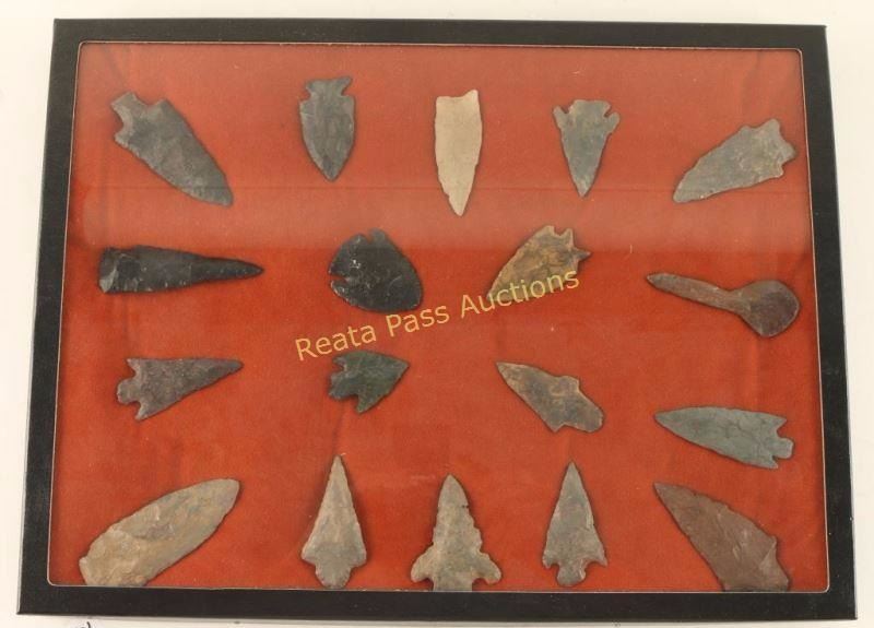 Midwest origin according to consignor, unknown age. Various sizes and shapes in Riker case with orange fabric background. Offered "as is", we don't guarantee the authenticity of this item, please do your research. All sales are final.