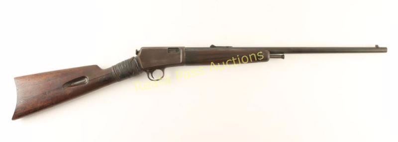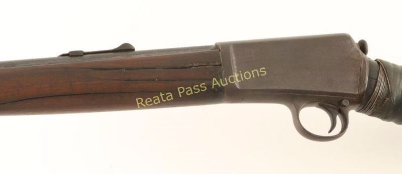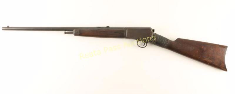 Vintage auto-loading rifle chambered in .22 Winchester Automatic Rimfire, circa 1917. Features a blued finish, 20" barrel stamped oval 'P', blade front sight, adjustable rear sporting sight, 10 round tubular magazine that loads through the butt of the stock, take-down receiver push button safety, smooth trigger, metal forend cap, smooth walnut forend and straight grip shoulder stock with metal buttplate. Rifle shows very little remaining finish with the majority of the metal surfaces turned to a dark brown patina. Action is smooth, bore is bright but shows a ring and wood stocks are poor with cracks & a repair at the wrist. Condition is fair. ***C&R Firearm*** ***Modern Firearm***