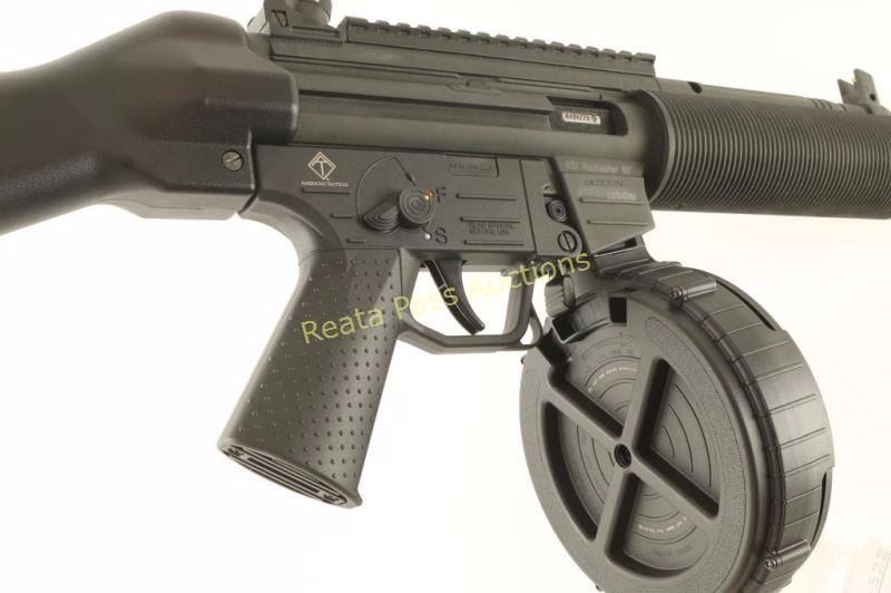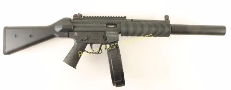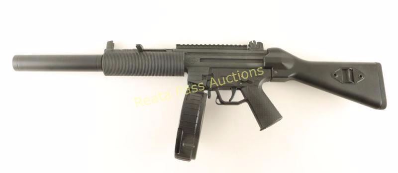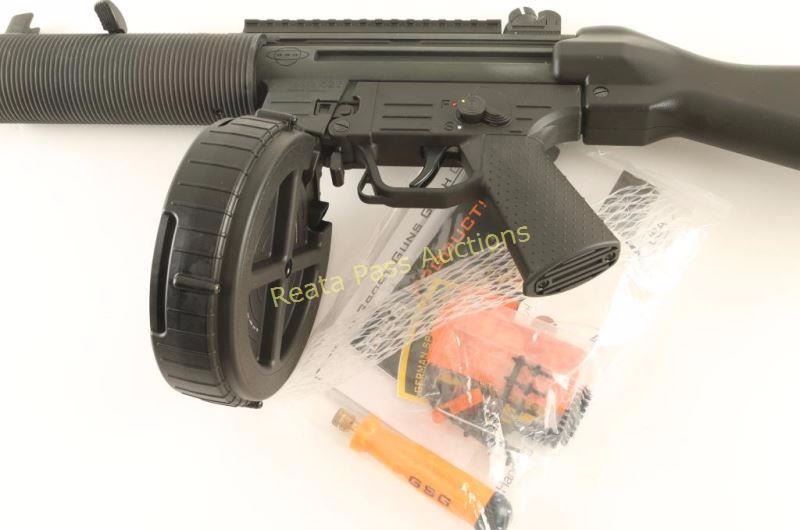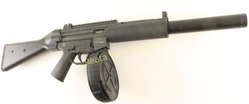 German made semi-automatic sporting rifle chambered in .22 Long Rifle, modeled after the HK MP5. Features a 16.25" barrel with faux suppressor, shrouded front sight, multi-aperture rotating rear sight, 50 round drum magazine, grooved rubber forend, ambidextrous safety, smooth trigger, black synthetic shoulder stock and black polymer body with integral scope rail & pebbled pistol grip. Includes factory documents and cleaning tools. Rifle shows only light handling wear. Action is smooth, bore is pristine, and stocks are fine. Condition is excellent. ***Modern Firearm***