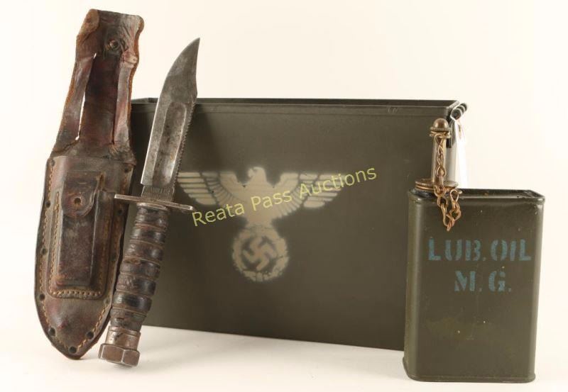 Green ammo can with Nazi marking no lid, Oiler marked LUB OIL M.G., and a Camillus military type knife and scabbard.