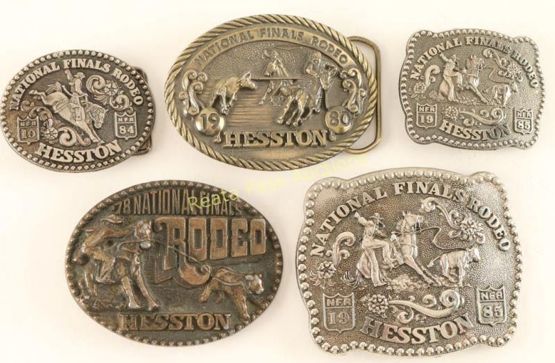 Hesston National final buckles from 1978, 1980. 1984, and two from 1985 in various shapes and sizes.