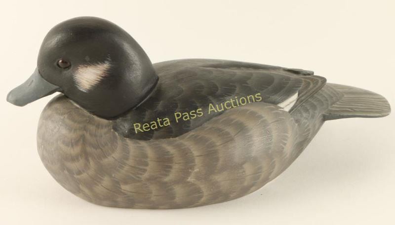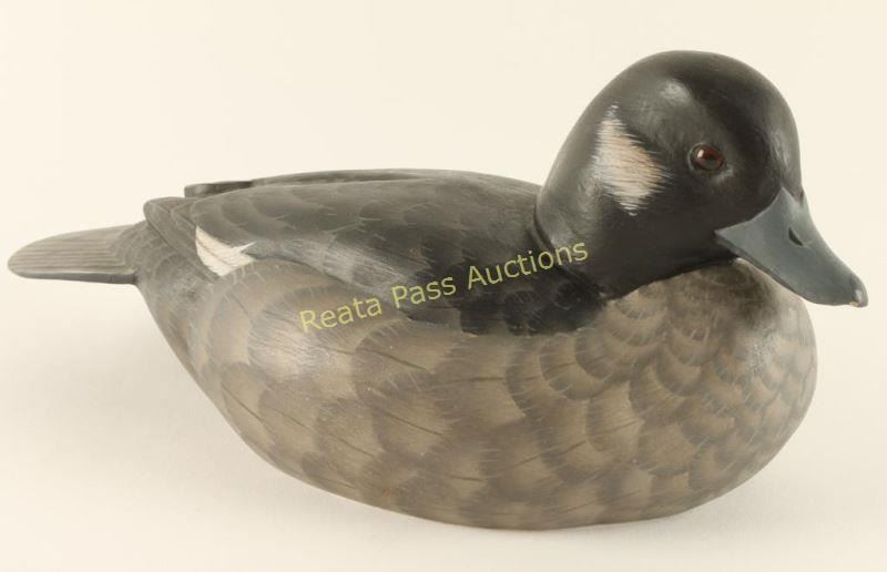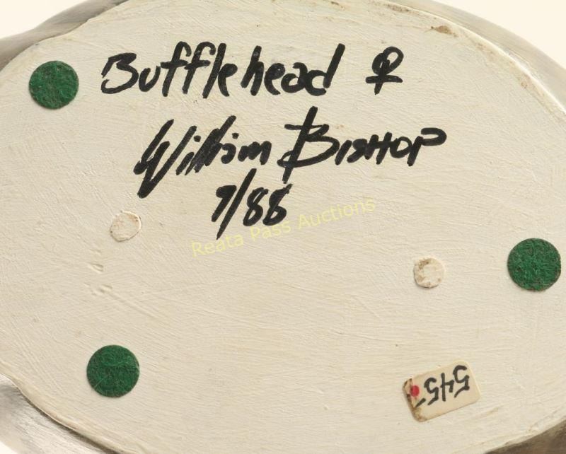 Bufflehead wood carving that has been hand painted, signed on bottom by artist. Very lifelike with extreme attention to detail. Measures 10"x4 1/2"x4". William Bishop is a wildlife artist who works in the medium of wood. Each sculpture is an original, detailed carving representing various species of waterfowl. Using natural wood, William brings out the beauty and grain, creating a unique and stunning piece of art. William was introduced to wildlife carving in 1983 when he attended a fund-raising dinner sponsored by Duck’s Unlimited. He was so impressed with wildlife sculpture and the people involved in this realm he began studying books on the subject acquiring a great admiration for this form of art. The dining room in his Santa Monica, California apartment was transformed into an artist studio. He has always wanted to work with wood and in 1986 he took a leap of faith, quit his job at UCLA, and began carving professionally. He did well in competitions, winning many blue ribbon and best of show awards in carving exhibitions throughout the United States. That very next year he was honored with the first place award in Life-Size Decorative Waterfowl category at the Ward Brothers World Championship held in Ocean City, Maryland.