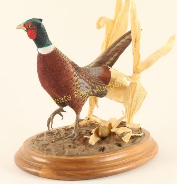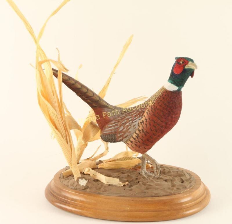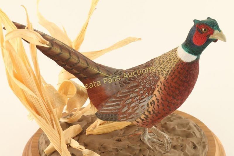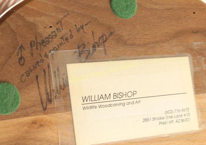 Ringneck Pheasant carved and hand painted with corn and cornstalks on wood base, signed by artist on bottom. Great attention to detail. Measures 7"x10"x6", part of tail has broken off and there is a small loss to clay on base. William Bishop is a wildlife artist who works in the medium of wood. Each sculpture is an original, detailed carving representing various species of wildlife. Using natural wood, William brings out the beauty and grain, creating a unique and stunning piece of art. William was introduced to wildlife carving in 1983 when he attended a fund-raising dinner sponsored by Duck’s Unlimited. He was so impressed with wildlife sculpture and the people involved in this realm he began studying books on the subject acquiring a great admiration for this form of art. The dining room in his Santa Monica, California apartment was transformed into an artist studio. He has always wanted to work with wood and in 1986 he took a leap of faith, quit his job at UCLA, and began carving professionally. He did well in competitions, winning many blue ribbon and best of show awards in carving exhibitions throughout the United States. That very next year he was honored with the first place award in Life-Size Decorative Waterfowl category at the Ward Brothers World Championship held in Ocean City, Maryland.
