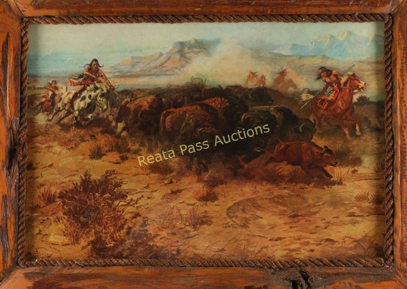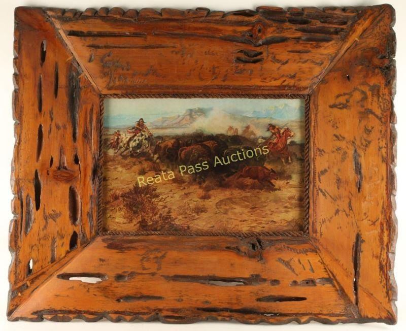 Charlie Russell artist depicting Indians at a buffalo kill. Image measures 21"x15" in a very large pine wormwood rustic frame. From the Larry Howard Estate.