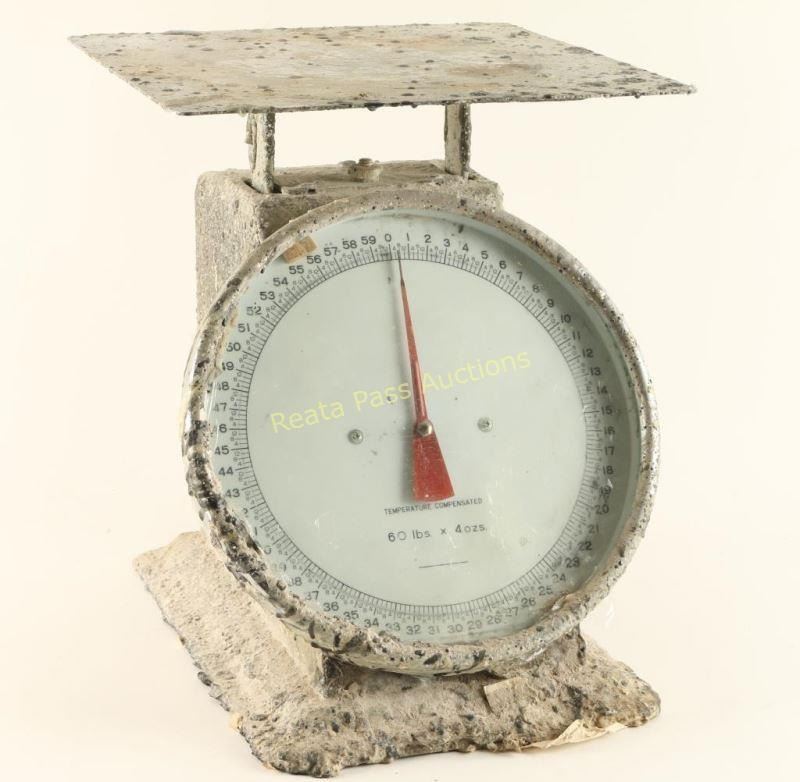 Fully function 60 lb scale from an artists studio. Features a large platform & rustic exterior from paint or plaster. Measures 14" x 12" x 14".